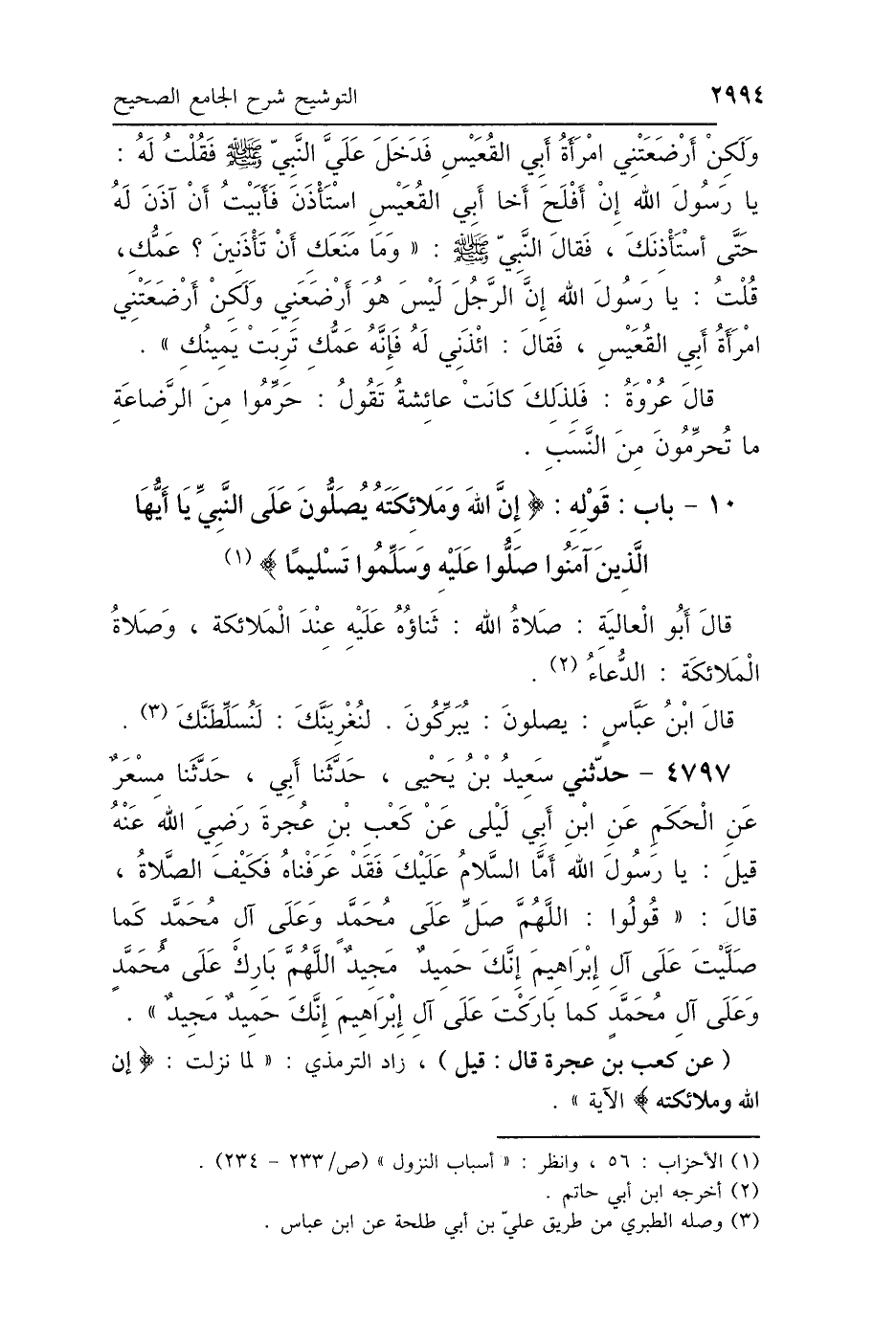 قَالَ أَبُو العَالِيَةِ: " صَلاَةُ اللَّهِ: ثَنَاؤُهُ عَلَيْهِ عِنْدَ المَلاَئِكَةِ، وَصَلاَةُ المَلاَئِكَةِ الدُّعَاءُ " قَالَ ابْنُ عَبَّاسٍ: " يُصَلُّونَ: يُبَرِّكُونَ {لَنُغْرِيَنَّكَ} [الأحزاب: 60]: لَنُسَلِّطَنَّكَ ".