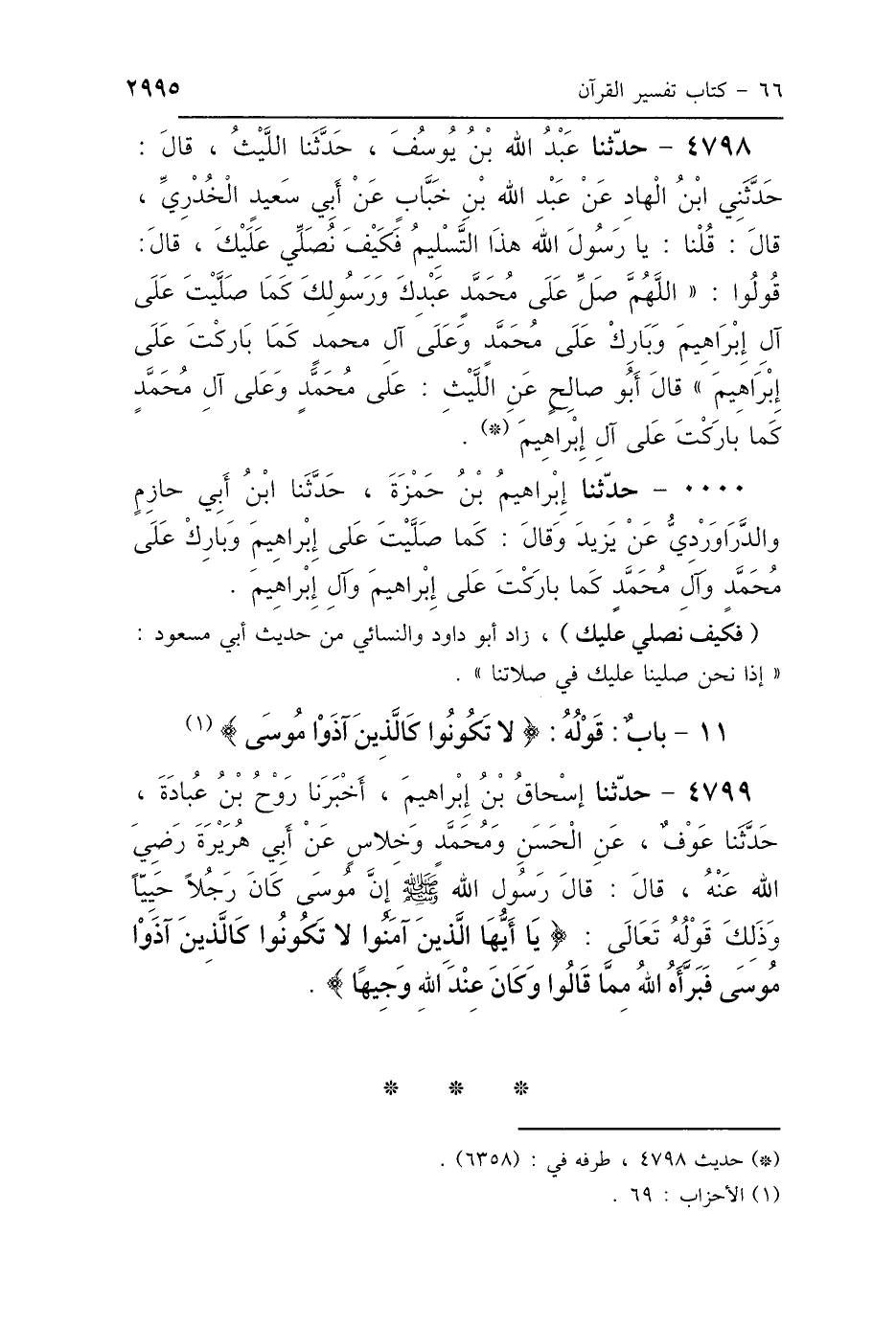 4798 - حَدَّثَنَا عَبْدُ اللَّهِ بْنُ يُوسُفَ، حَدَّثَنَا اللَّيْثُ، قَالَ: حَدَّثَنِي ابْنُ الهَادِ، عَنْ عَبْدِ اللَّهِ بْنِ خَبَّابٍ، عَنْ أَبِي سَعِيدٍ الخُدْرِيِّ، قَالَ: قُلْنَا: يَا رَسُولَ اللَّهِ هَذَا التَّسْلِيمُ فَكَيْفَ نُصَلِّي عَلَيْكَ؟ قَالَ: " قُولُوا: اللَّهُمَّ صَلِّ عَلَى مُحَمَّدٍ عَبْدِكَ وَرَسُولِكَ، كَمَا صَلَّيْتَ عَلَى آلِ إِبْرَاهِيمَ، وَبَارِكْ عَلَى مُحَمَّدٍ، وَعَلَى آلِ مُحَمَّدٍ، كَمَا بَارَكْتَ عَلَى إِبْرَاهِيمَ " قَالَ أَبُو صَالِحٍ عَنِ اللَّيْثِ: «عَلَى مُحَمَّدٍ، وَعَلَى آلِ مُحَمَّدٍ، كَمَا بَارَكْتَ عَلَى آلِ إِبْرَاهِيمَ» حَدَّثَنَا إِبْرَاهِيمُ بْنُ حَمْزَةَ، حَدَّثَنَا ابْنُ أَبِي حَازِمٍ وَالدَّرَاوَرْدِيُّ، عَنْ يَزِيدَ، وَقَالَ: «كَمَا صَلَّيْتَ عَلَى إِبْرَاهِيمَ، وَبَارِكْ عَلَى مُحَمَّدٍ، وَآلِ مُحَمَّدٍ، كَمَا بَارَكْتَ عَلَى إِبْرَاهِيمَ وَآلِ إِبْرَاهِيمَ».