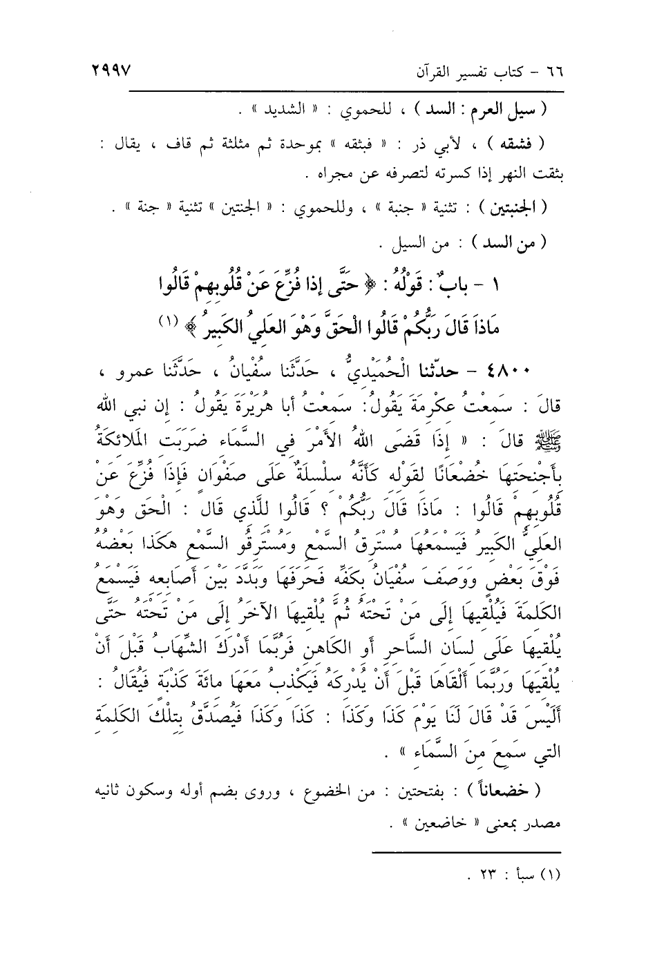 1 - بَابُ {حَتَّى إِذَا فُزِّعَ عَنْ قُلُوبِهِمْ قَالُوا [ص:122]: مَاذَا قَالَ رَبُّكُمْ؟ قَالُوا: الحَقَّ وَهُوَ العَلِيُّ الكَبِيرُ}