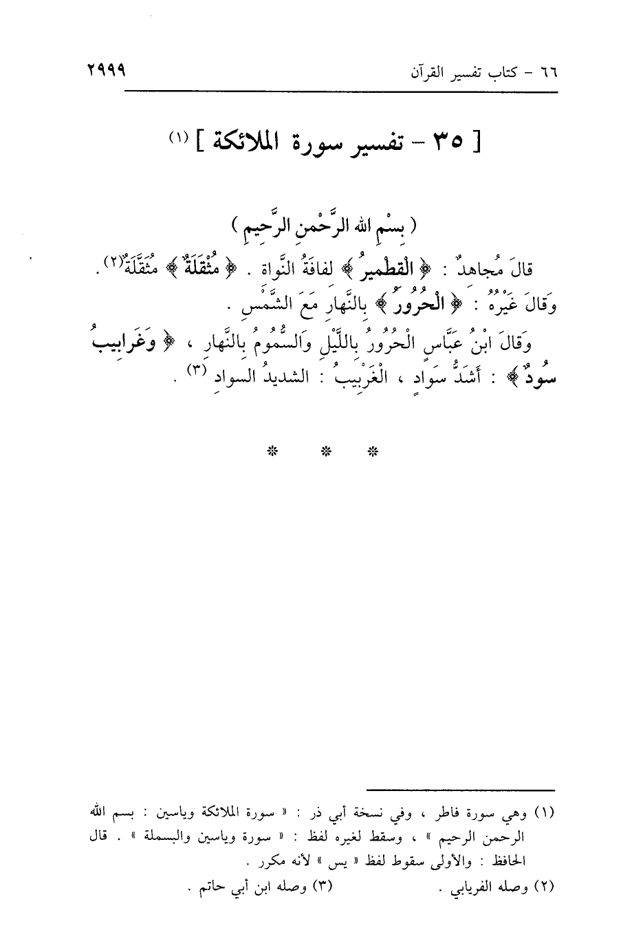 قَالَ مُجَاهِدٌ: " القِطْمِيرُ: لِفَافَةُ النَّوَاةِ، {مُثْقَلَةٌ} [فاطر: 18]: مُثَقَّلَةٌ " وَقَالَ غَيْرُهُ: {الحَرُورُ} [فاطر: 21]: «بِالنَّهَارِ مَعَ الشَّمْسِ» وَقَالَ ابْنُ عَبَّاسٍ: {الحَرُورُ} [فاطر: 21]: «بِاللَّيْلِ وَالسَّمُومُ بِالنَّهَارِ»، {وَغَرَابِيبُ} [فاطر: 27]: أَشَدُّ سَوَادٍ، الغِرْبِيبُ: الشَّدِيدُ السَّوَادِ.