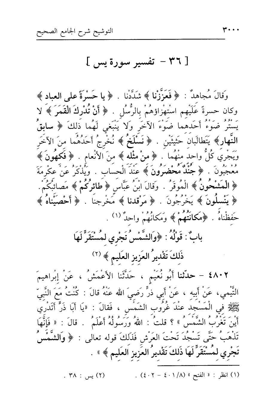 4802 - حَدَّثَنَا أَبُو نُعَيْمٍ، حَدَّثَنَا الأَعْمَشُ، عَنْ إِبْرَاهِيمَ التَّيْمِيِّ، عَنْ أَبِيهِ، عَنْ أَبِي ذَرٍّ رَضِيَ اللَّهُ عَنْهُ، قَالَ: كُنْتُ مَعَ النَّبِيِّ صَلَّى اللهُ عَلَيْهِ وَسَلَّمَ فِي المَسْجِدِ عِنْدَ غُرُوبِ الشَّمْسِ، فَقَالَ: «يَا أَبَا ذَرٍّ أَتَدْرِي أَيْنَ تَغْرُبُ الشَّمْسُ؟» قُلْتُ: اللَّهُ وَرَسُولُهُ أَعْلَمُ، قَالَ: «فَإِنَّهَا تَذْهَبُ حَتَّى تَسْجُدَ تَحْتَ العَرْشِ»، فَذَلِكَ قَوْلُهُ تَعَالَى: {وَالشَّمْسُ تَجْرِي لِمُسْتَقَرٍّ} [يس: 38] لَهَا ذَلِكَ تَقْدِيرُ العَزِيزِ العَلِيمِ.