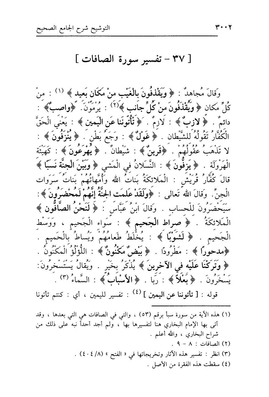وَقَالَ مُجَاهِدٌ: {وَيَقْذِفُونَ بِالْغَيْبِ مِنْ مَكَانٍ بَعِيدٍ} [سبأ: 53]: «مِنْ كُلِّ مَكَانٍ»، {وَيُقْذَفُونَ مِنْ كُلِّ جَانِبٍ} [الصافات: 8]: «يُرْمَوْنَ»، {وَاصِبٌ} [الصافات: 9]: «دَائِمٌ»، {لاَزِبٌ} [الصافات: 11]: «لاَزِمٌ»، {تَأْتُونَنَا عَنِ اليَمِينِ} [الصافات: 28]: «يَعْنِي الحَقَّ، الكُفَّارُ تَقُولُهُ لِلشَّيْطَانِ»، {غَوْلٌ} [الصافات: 47]: «وَجَعُ بَطْنٍ»، {يُنْزَفُونَ} [الصافات: 47]: «لاَ تَذْهَبُ عُقُولُهُمْ»، {قَرِينٌ} [الصافات: 51]: «شَيْطَانٌ»، {يُهْرَعُونَ} [هود: 78]: «كَهَيْئَةِ الهَرْوَلَةِ»، {يَزِفُّونَ} [الصافات: 94]: «النَّسَلاَنُ فِي المَشْيِ»، {وَبَيْنَ الجِنَّةِ نَسَبًا} [الصافات: 158]: " قَالَ: كُفَّارُ قُرَيْشٍ المَلاَئِكَةُ بَنَاتُ اللَّهِ، وَأُمَّهَاتُهُمْ بَنَاتُ سَرَوَاتِ الجِنِّ "، وَقَالَ اللَّهُ تَعَالَى: {وَلَقَدْ عَلِمَتِ الجِنَّةُ إِنَّهُمْ لَمُحْضَرُونَ} [الصافات: 158]: «سَتُحْضَرُ لِلْحِسَابِ» وَقَالَ ابْنُ عَبَّاسٍ: {لَنَحْنُ الصَّافُّونَ} [الصافات: 165]: «المَلاَئِكَةُ»، {صِرَاطِ الجَحِيمِ} [الصافات: 23]، {سَوَاءِ الجَحِيمِ} [الصافات: 55]: «وَوَسَطِ الجَحِيمِ»، {لَشَوْبًا} [الصافات: 67]: «يُخْلَطُ طَعَامُهُمْ، وَيُسَاطُ بِالحَمِيمِ»، {مَدْحُورًا} [الأعراف: 18]: «مَطْرُودًا»، {بَيْضٌ مَكْنُونٌ} [الصافات: 49]: «اللُّؤْلُؤُ المَكْنُونُ»، {وَتَرَكْنَا عَلَيْهِ فِي الآخِرِينَ} [الصافات: 78]: «يُذْكَرُ بِخَيْرٍ»، وَيُقَالُ {يَسْتَسْخِرُونَ} [الصافات: 14]: «يَسْخَرُونَ»، {بَعْلًا} [الصافات: 125]: «رَبًّا».