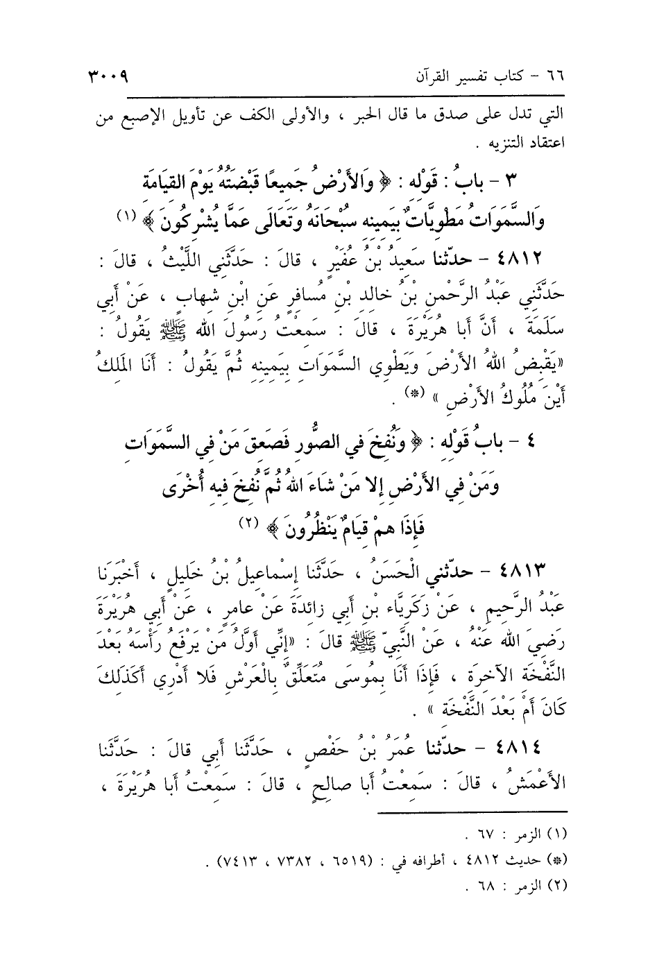 4 - بَابُ قَوْلِهِ: {وَنُفِخَ فِي الصُّورِ فَصَعِقَ مَنْ فِي السَّمَوَاتِ وَمَنْ فِي الأَرْضِ، إِلَّا مَنْ شَاءَ اللَّهُ، ثُمَّ نُفِخَ فِيهِ أُخْرَى فَإِذَا هُمْ قِيَامٌ يَنْظُرُونَ}