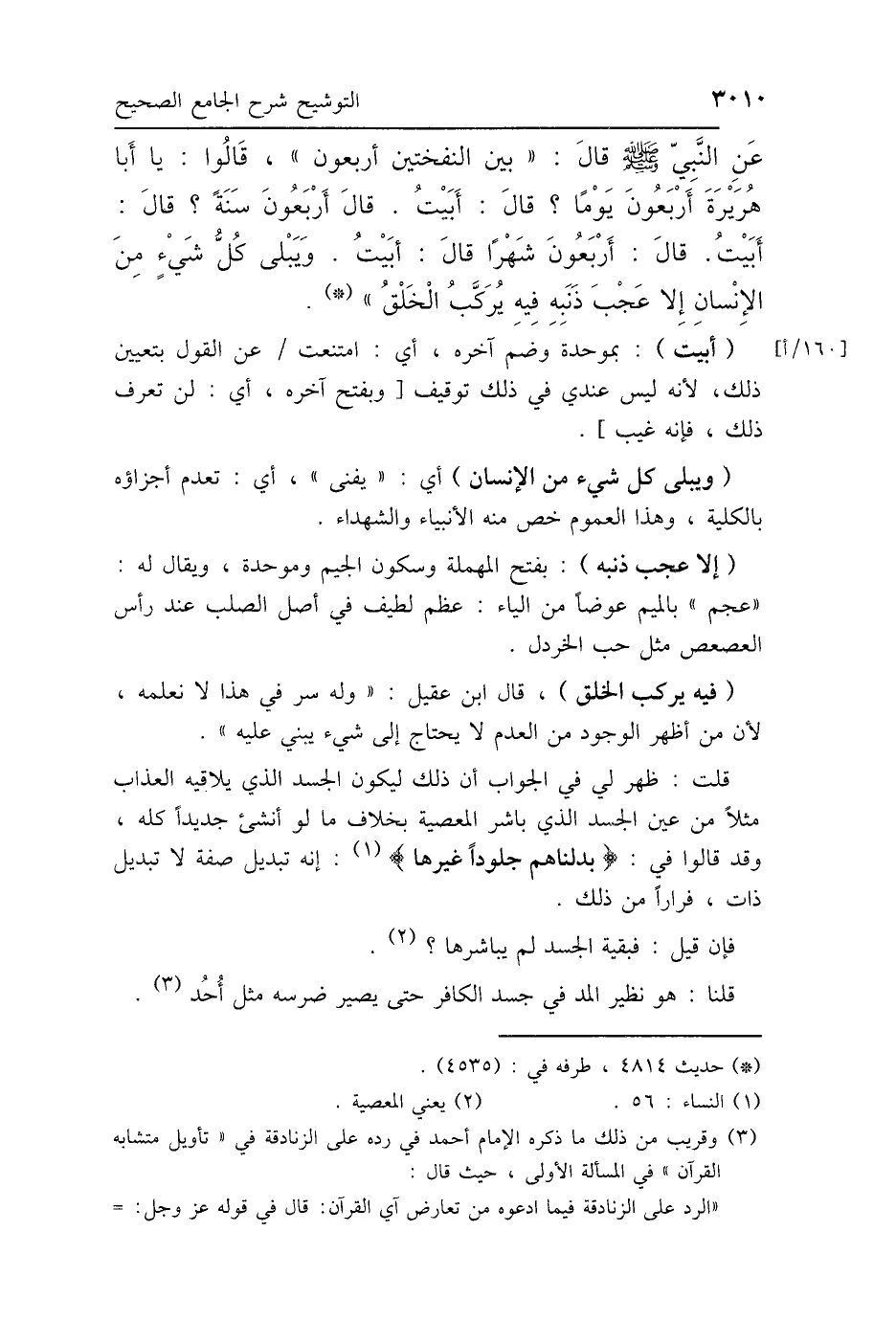 عَنِ النَّبِيِّ صَلَّى اللهُ عَلَيْهِ وَسَلَّمَ قَالَ: «بَيْنَ النَّفْخَتَيْنِ أَرْبَعُونَ» قَالُوا: يَا أَبَا هُرَيْرَةَ أَرْبَعُونَ يَوْمًا، قَالَ: أَبَيْتُ، قَالَ: أَرْبَعُونَ سَنَةً، قَالَ: أَبَيْتُ، قَالَ: أَرْبَعُونَ شَهْرًا، قَالَ: «أَبَيْتُ وَيَبْلَى كُلُّ شَيْءٍ مِنَ الإِنْسَانِ، إِلَّا عَجْبَ ذَنَبِهِ، فِيهِ يُرَكَّبُ الخَلْقُ».