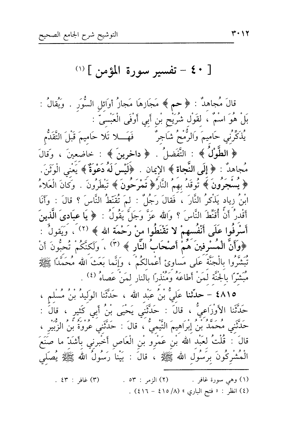{الطَّوْلِ} [التوبة: 86] التَّفَضُّلُ، {دَاخِرِينَ} [النمل: 87] خَاضِعِينَ " وَقَالَ مُجَاهِدٌ: " {إِلَى النَّجَاةِ} [غافر: 41] الإِيمَانُ، {لَيْسَ لَهُ دَعْوَةٌ} [غافر: 43] يَعْنِي الوَثَنَ، {يُسْجَرُونَ} [غافر: 72] تُوقَدُ بِهِمُ النَّارُ، {تَمْرَحُونَ} [غافر: 75] تَبْطَرُونَ «، وَكَانَ العَلاَءُ بْنُ زِيَادٍ يُذَكِّرُ النَّارَ، فَقَالَ» رَجُلٌ لِمَ تُقَنِّطِ النَّاسَ، قَالَ: وَأَنَا أَقْدِرُ أَنْ أُقَنِّطَ النَّاسَ، وَاللَّهُ عَزَّ وَجَلَّ يَقُولُ: {يَا عِبَادِيَ الَّذِينَ أَسْرَفُوا عَلَى أَنْفُسِهِمْ لاَ تَقْنَطُوا مِنْ رَحْمَةِ اللَّهِ} [الزمر: 53] وَيَقُولُ {وَأَنَّ المُسْرِفِينَ هُمْ أَصْحَابُ النَّارِ} [غافر: 43] وَلَكِنَّكُمْ تُحِبُّونَ أَنْ تُبَشَّرُوا بِالْجَنَّةِ عَلَى مَسَاوِئِ أَعْمَالِكُمْ، وَإِنَّمَا بَعَثَ اللَّهُ مُحَمَّدًا صَلَّى اللهُ عَلَيْهِ وَسَلَّمَ مُبَشِّرًا بِالْجَنَّةِ لِمَنْ أَطَاعَهُ، وَمُنْذِرًا بِالنَّارِ مَنْ عَصَاهُ.