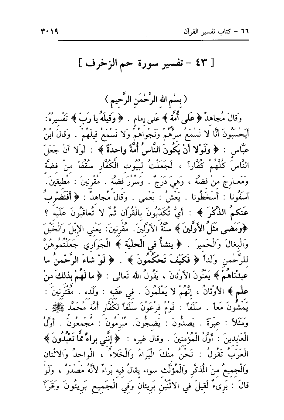 وَقَالَ مُجَاهِدٌ: {عَلَى أُمَّةٍ} [الزخرف: 22]: «عَلَى إِمَامٍ»، {وَقِيلِهِ يَا رَبِّ}: «تَفْسِيرُهُ، أَيَحْسِبُونَ أَنَّا لاَ نَسْمَعُ سِرَّهُمْ وَنَجْوَاهُمْ، وَلاَ نَسْمَعُ قِيلَهُمْ» وَقَالَ ابْنُ عَبَّاسٍ: {وَلَوْلاَ أَنْ يَكُونَ النَّاسُ أُمَّةً وَاحِدَةً} [الزخرف: 33]: «لَوْلاَ أَنْ جَعَلَ النَّاسَ كُلَّهُمْ كُفَّارًا، لَجَعَلْتُ لِبُيُوتِ الكُفَّارِ» (سَقْفًا مِنْ فِضَّةٍ وَمَعَارِجَ): «مِنْ فِضَّةٍ، وَهِيَ دَرَجٌ، وَسُرُرَ فِضَّةٍ» {مُقْرِنِينَ} [إبراهيم: 49]: «مُطِيقِينَ»، {آسَفُونَا} [الزخرف: 55]: «أَسْخَطُونَا»، {يَعْشُ} [الزخرف: 36]: «يَعْمَى» وَقَالَ مُجَاهِدٌ: {أَفَنَضْرِبُ عَنْكُمُ الذِّكْرَ} [الزخرف: 5]: «أَيْ تُكَذِّبُونَ بِالقُرْآنِ، ثُمَّ لاَ تُعَاقَبُونَ عَلَيْهِ؟» {وَمَضَى مَثَلُ الأَوَّلِينَ} [الزخرف: 8]: «سُنَّةُ الأَوَّلِينَ» {وَمَا كُنَّا لَهُ مُقْرِنِينَ} [الزخرف: 13]: «يَعْنِي الإِبِلَ وَالخَيْلَ وَالبِغَالَ وَالحَمِيرَ». (يَنْشَأُ فِي الحِلْيَةِ): «الجَوَارِي، جَعَلْتُمُوهُنَّ لِلرَّحْمَنِ وَلَدًا، فَكَيْفَ تَحْكُمُونَ؟»، {لَوْ شَاءَ الرَّحْمَنُ مَا عَبَدْنَاهُمْ} [الزخرف: 20]: «يَعْنُونَ الأَوْثَانَ»، يَقُولُ اللَّهُ تَعَالَى: {مَا لَهُمْ بِذَلِكَ مِنْ عِلْمٍ} [الزخرف: 20]: «أَيِ الأَوْثَانُ، إِنَّهُمْ لاَ يَعْلَمُونَ»، {فِي عَقِبِهِ} [الزخرف: 28]: «وَلَدِهِ»، {مُقْتَرِنِينَ} [الزخرف: 53]: «يَمْشُونَ مَعًا»، {سَلَفًا} [الزخرف: 56]: «قَوْمُ فِرْعَوْنَ سَلَفًا لِكُفَّارِ أُمَّةِ مُحَمَّدٍ صَلَّى اللهُ عَلَيْهِ وَسَلَّمَ». {وَمَثَلًا} [النور: 34]: «عِبْرَةً»، {يَصِدُّونَ} [النساء: 61]: «يَضِجُّونَ»، {مُبْرِمُونَ} [الزخرف: 79]: «مُجْمِعُونَ»، {أَوَّلُ العَابِدِينَ} [الزخرف: 81]: «أَوَّلُ المُؤْمِنِينَ» وَقَالَ غَيْرُهُ: {إِنَّنِي بَرَاءٌ مِمَّا تَعْبُدُونَ} [الزخرف: 26]: " العَرَبُ تَقُولُ: نَحْنُ مِنْكَ البَرَاءُ وَالخَلاَءُ، وَالوَاحِدُ وَالِاثْنَانِ وَالجَمِيعُ، مِنَ المُذَكَّرِ وَالمُؤَنَّثِ، يُقَالُ فِيهِ: بَرَاءٌ، لِأَنَّهُ مَصْدَرٌ، وَلَوْ قَالَ: بَرِيءٌ لَقِيلَ فِي الِاثْنَيْنِ: بَرِيئَانِ، وَفِي الجَمِيعِ: بَرِيئُونَ وَقَرَأَ