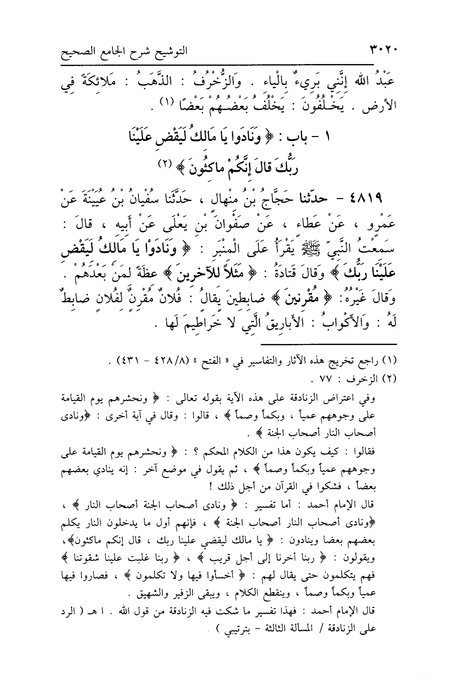 1 - بَابُ قَوْلِهِ: {وَنَادَوْا يَا مَالِكُ لِيَقْضِ عَلَيْنَا رَبُّكَ، قَالَ: إِنَّكُمْ مَاكِثُونَ} [الزخرف: 77]