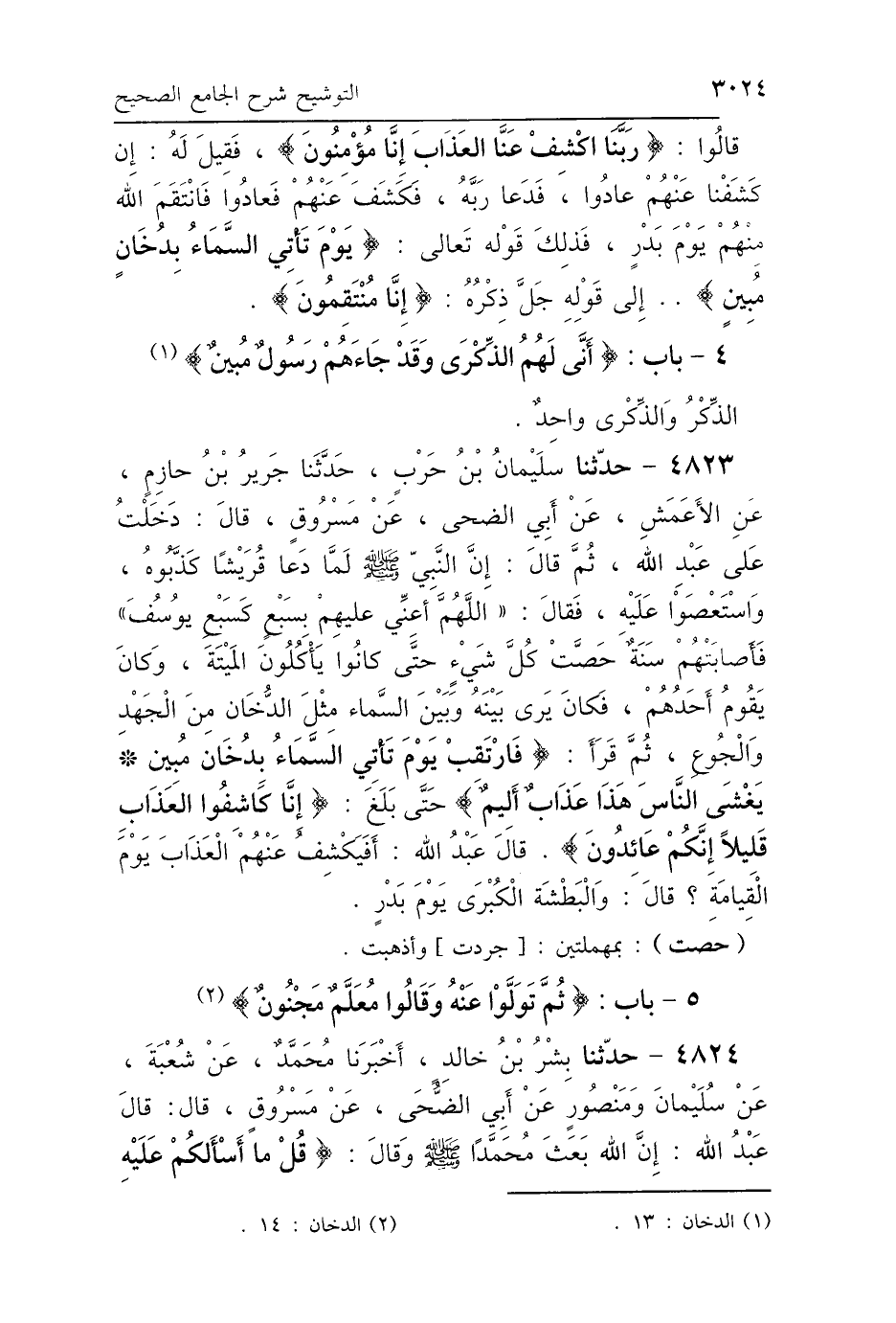 4823 - حَدَّثَنَا سُلَيْمَانُ بْنُ حَرْبٍ، حَدَّثَنَا جَرِيرُ بْنُ حَازِمٍ، عَنِ الأَعْمَشِ، عَنْ أَبِي الضُّحَى، عَنْ مَسْرُوقٍ، قَالَ: دَخَلْتُ عَلَى عَبْدِ اللَّهِ ثُمَّ قَالَ: إِنَّ رَسُولَ اللَّهِ صَلَّى اللهُ عَلَيْهِ وَسَلَّمَ لَمَّا دَعَا قُرَيْشًا كَذَّبُوهُ وَاسْتَعْصَوْا عَلَيْهِ، فَقَالَ: «اللَّهُمَّ أَعِنِّي عَلَيْهِمْ بِسَبْعٍ كَسَبْعِ يُوسُفَ» فَأَصَابَتْهُمْ سَنَةٌ حَصَّتْ، يَعْنِي كُلَّ شَيْءٍ، حَتَّى كَانُوا يَأْكُلُونَ المَيْتَةَ، فَكَانَ يَقُومُ أَحَدُهُمْ فَكَانَ يَرَى بَيْنَهُ وَبَيْنَ السَّمَاءِ مِثْلَ الدُّخَانِ مِنَ الجَهْدِ وَالجُوعِ، ثُمَّ قَرَأَ: {فَارْتَقِبْ يَوْمَ تَأْتِي السَّمَاءُ بِدُخَانٍ مُبِينٍ، يَغْشَى النَّاسَ هَذَا عَذَابٌ أَلِيمٌ} [الدخان: 11]، حَتَّى بَلَغَ {إِنَّا كَاشِفُو العَذَابِ قَلِيلًا إِنَّكُمْ عَائِدُونَ} [الدخان: 15]، قَالَ عَبْدُ اللَّهِ أَفَيُكْشَفُ عَنْهُمُ العَذَابُ يَوْمَ القِيَامَةِ؟ قَالَ: وَالبَطْشَةُ الكُبْرَى يَوْمَ بَدْرٍ.