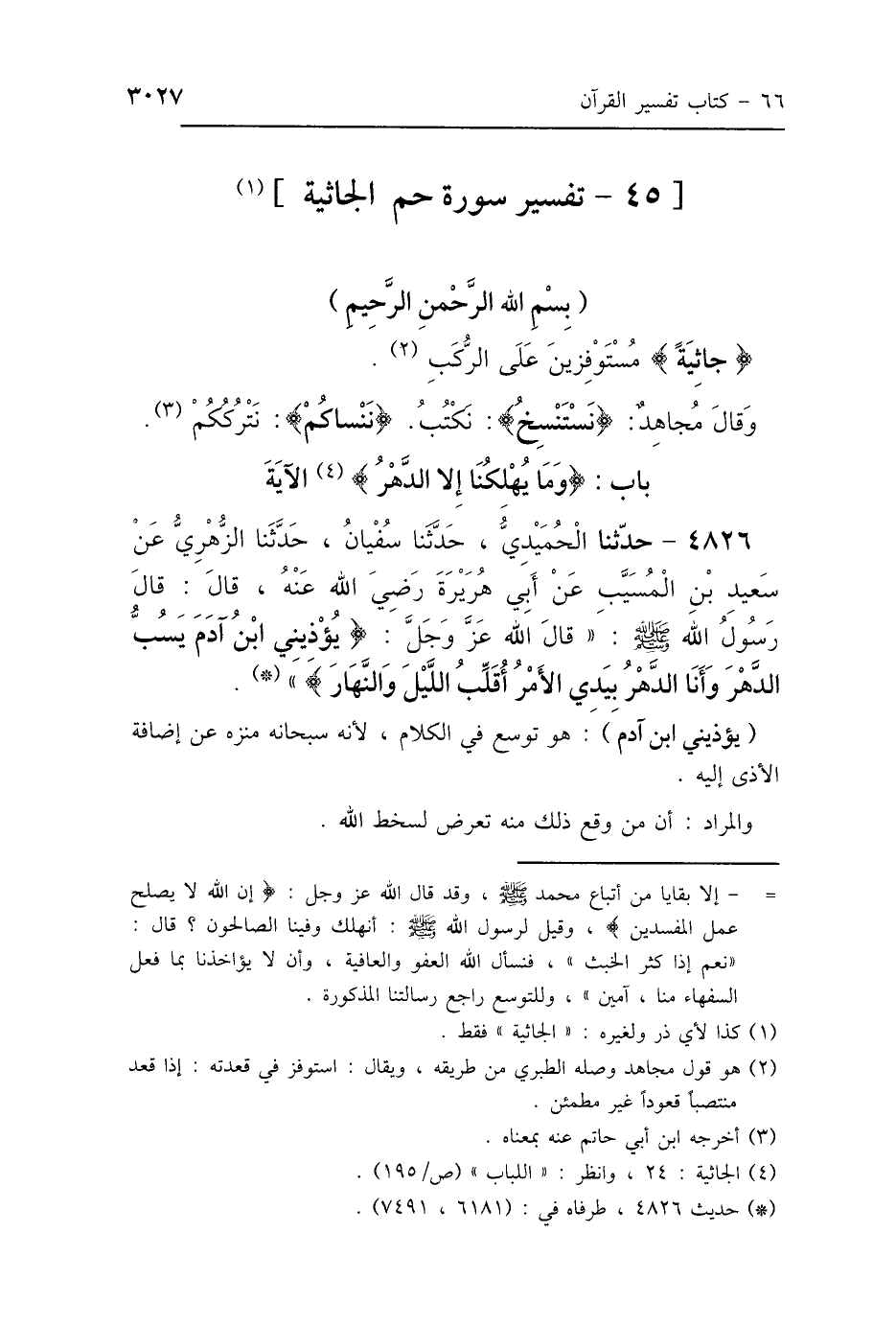 4826 - حَدَّثَنَا الحُمَيْدِيُّ، حَدَّثَنَا سُفْيَانُ، حَدَّثَنَا الزُّهْرِيُّ، عَنْ سَعِيدِ بْنِ المُسَيِّبِ، عَنْ أَبِي هُرَيْرَةَ رَضِيَ اللَّهُ عَنْهُ، قَالَ: قَالَ رَسُولُ اللَّهِ صَلَّى اللهُ عَلَيْهِ وَسَلَّمَ قَالَ اللَّهُ عَزَّ وَجَلَّ: " يُؤْذِينِي ابْنُ آدَمَ يَسُبُّ الدَّهْرَ وَأَنَا الدَّهْرُ، بِيَدِي الأَمْرُ أُقَلِّبُ اللَّيْلَ وَالنَّهَارَ.