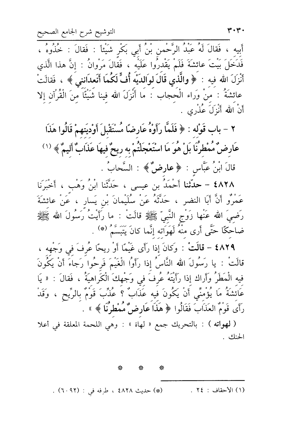 2 - بَابُ قَوْلِهِ: {فَلَمَّا رَأَوْهُ عَارِضًا مُسْتَقْبِلَ أَوْدِيَتِهِمْ قَالُوا: هَذَا عَارِضٌ مُمْطِرُنَا بَلْ هُوَ مَا اسْتَعْجَلْتُمْ بِهِ رِيحٌ فِيهَا عَذَابٌ أَلِيمٌ} [الأحقاف: 24]