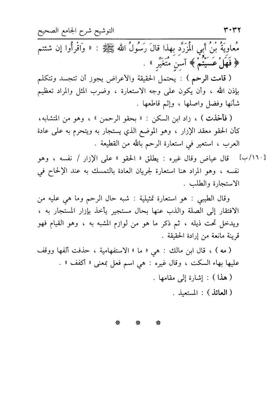 وقال الطيبي: هو استعارة تمثيلية: شبه حال الرحم وما هي عليه من الافتقار إلى الصلة والذب عنها بحال مستجير يأخذ بإزار المستجار به، ويدخل تحت ذيله، ثم ذكر ما هو من لوازم المشبه به، وهو القيام فهو قرينة مانعة من إرادة الحقيقة.