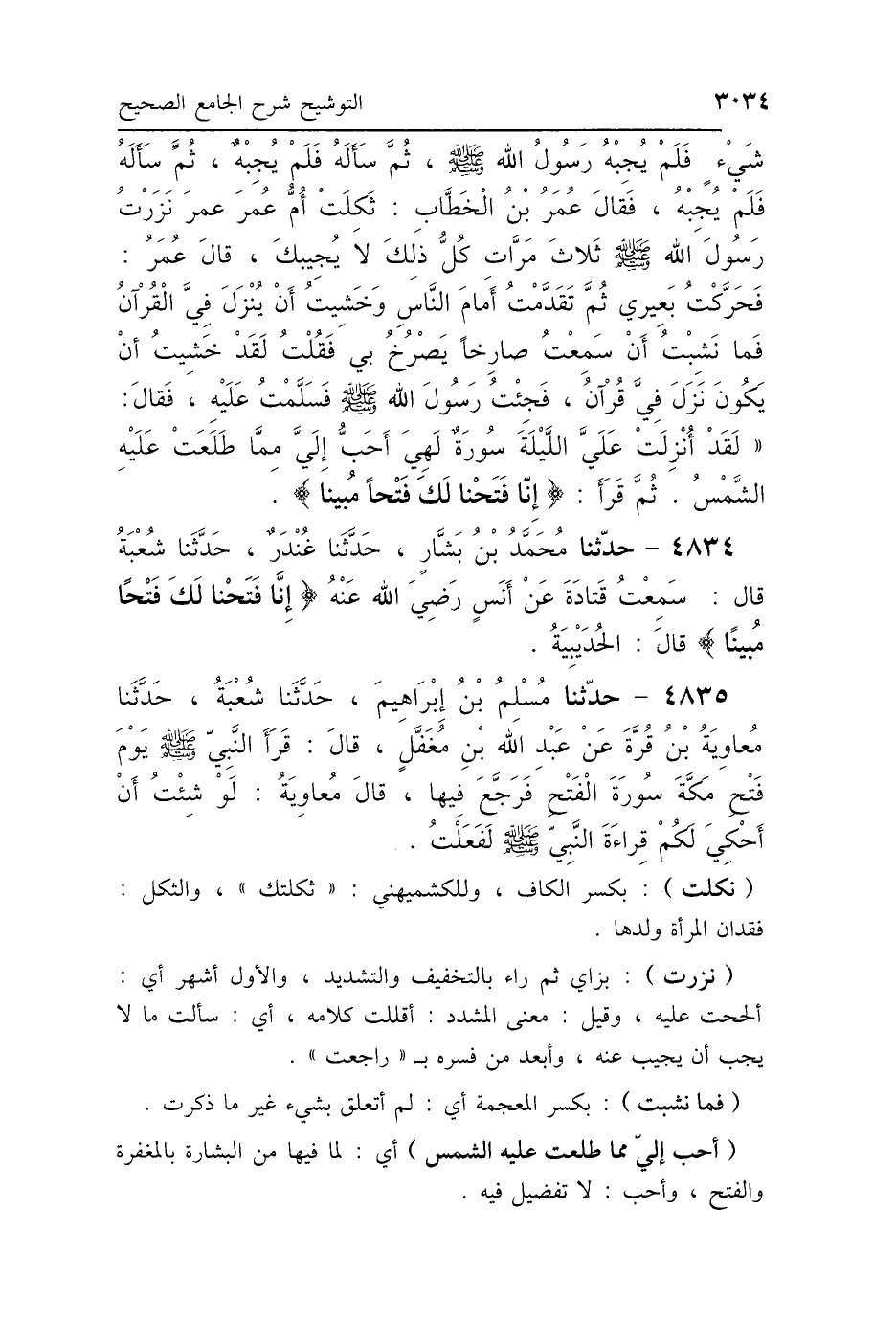 شَيْءٍ فَلَمْ يُجِبْهُ رَسُولُ اللَّهِ صَلَّى اللهُ عَلَيْهِ وَسَلَّمَ، ثُمَّ سَأَلَهُ فَلَمْ يُجِبْهُ، ثُمَّ سَأَلَهُ فَلَمْ يُجِبْهُ، فَقَالَ عُمَرُ بْنُ الخَطَّابِ: ثَكِلَتْ أُمُّ عُمَرَ، نَزَرْتَ رَسُولَ اللَّهِ صَلَّى اللهُ عَلَيْهِ وَسَلَّمَ ثَلاَثَ مَرَّاتٍ، كُلَّ ذَلِكَ لاَ يُجِيبُكَ، قَالَ عُمَرُ: فَحَرَّكْتُ بَعِيرِي ثُمَّ تَقَدَّمْتُ أَمَامَ النَّاسِ، وَخَشِيتُ أَنْ يُنْزَلَ فِيَّ قُرْآنٌ، فَمَا نَشِبْتُ أَنْ سَمِعْتُ صَارِخًا يَصْرُخُ بِي، فَقُلْتُ: لَقَدْ خَشِيتُ أَنْ يَكُونَ نَزَلَ فِيَّ قُرْآنٌ، فَجِئْتُ رَسُولَ اللَّهِ صَلَّى اللهُ عَلَيْهِ وَسَلَّمَ فَسَلَّمْتُ عَلَيْهِ فَقَالَ: " لَقَدْ أُنْزِلَتْ عَلَيَّ اللَّيْلَةَ سُورَةٌ لَهِيَ أَحَبُّ إِلَيَّ مِمَّا طَلَعَتْ عَلَيْهِ الشَّمْسُ، ثُمَّ قَرَأَ: {إِنَّا فَتَحْنَا لَكَ فَتْحًا مُبِينًا} [الفتح: 1].
