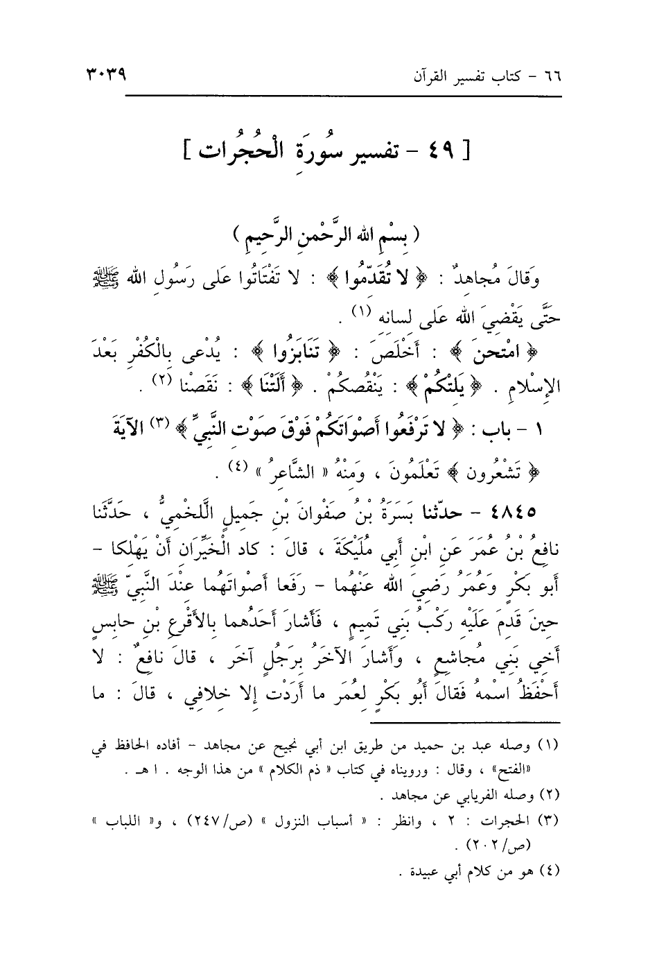 وَقَالَ مُجَاهِدٌ: {لاَ تُقَدِّمُوا} [الحجرات: 1]: «لاَ تَفْتَاتُوا عَلَى رَسُولِ اللَّهِ صَلَّى اللهُ عَلَيْهِ وَسَلَّمَ حَتَّى يَقْضِيَ اللَّهُ عَلَى لِسَانِهِ»، {امْتَحَنَ} [الحجرات: 3]: «أَخْلَصَ»، {وَلاَ تَنَابَزُوا} [الحجرات: 11]: «يُدْعَى بِالكُفْرِ بَعْدَ الإِسْلاَمِ»، {يَلِتْكُمْ} [الحجرات: 14]: " يَنْقُصْكُمْ أَلَتْنَا: نَقَصْنَا.