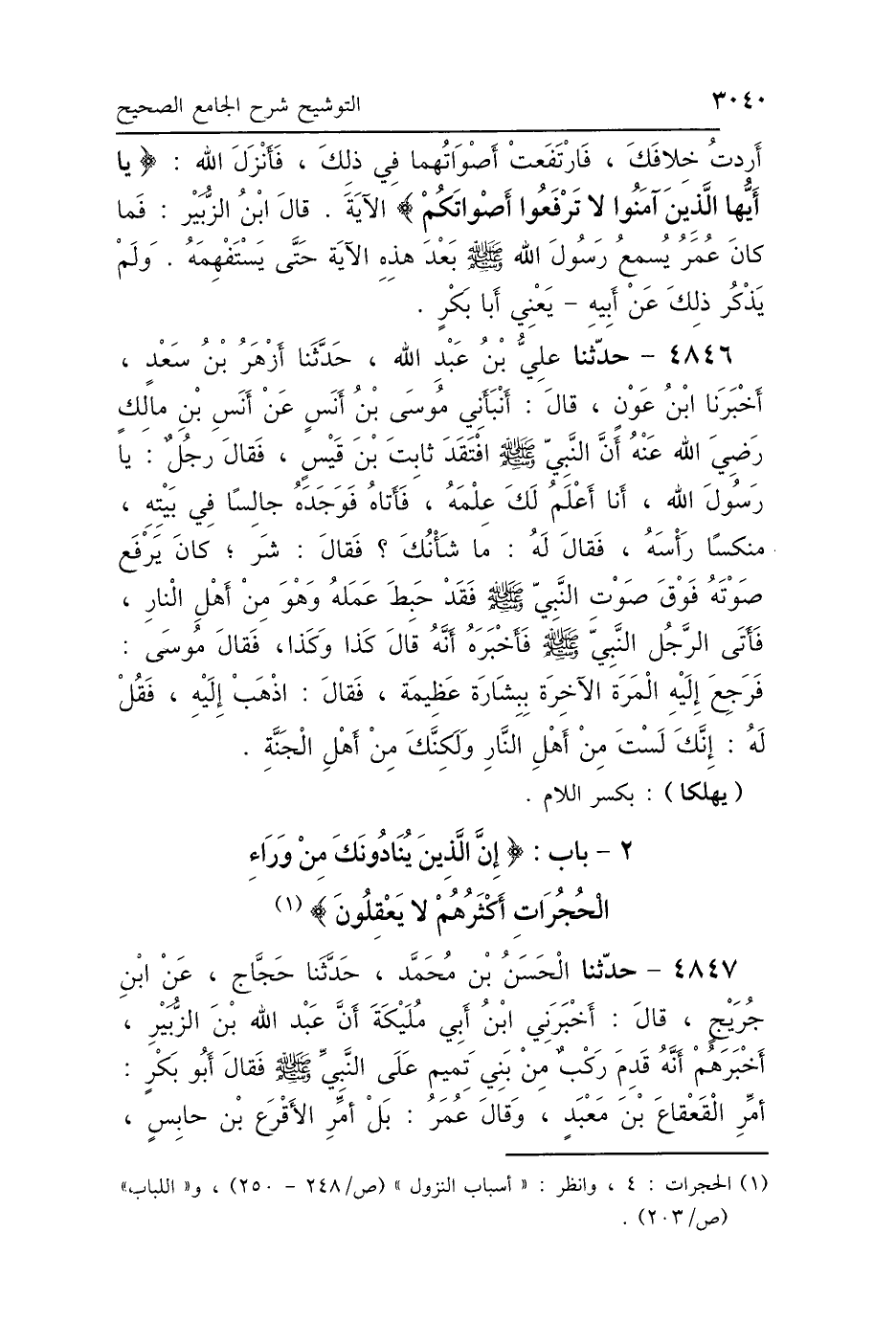 2 - بَابُ {إِنَّ الَّذِينَ يُنَادُونَكَ مِنْ وَرَاءِ الحُجُرَاتِ أَكْثَرُهُمْ لاَ يَعْقِلُونَ} [الحجرات: 4]