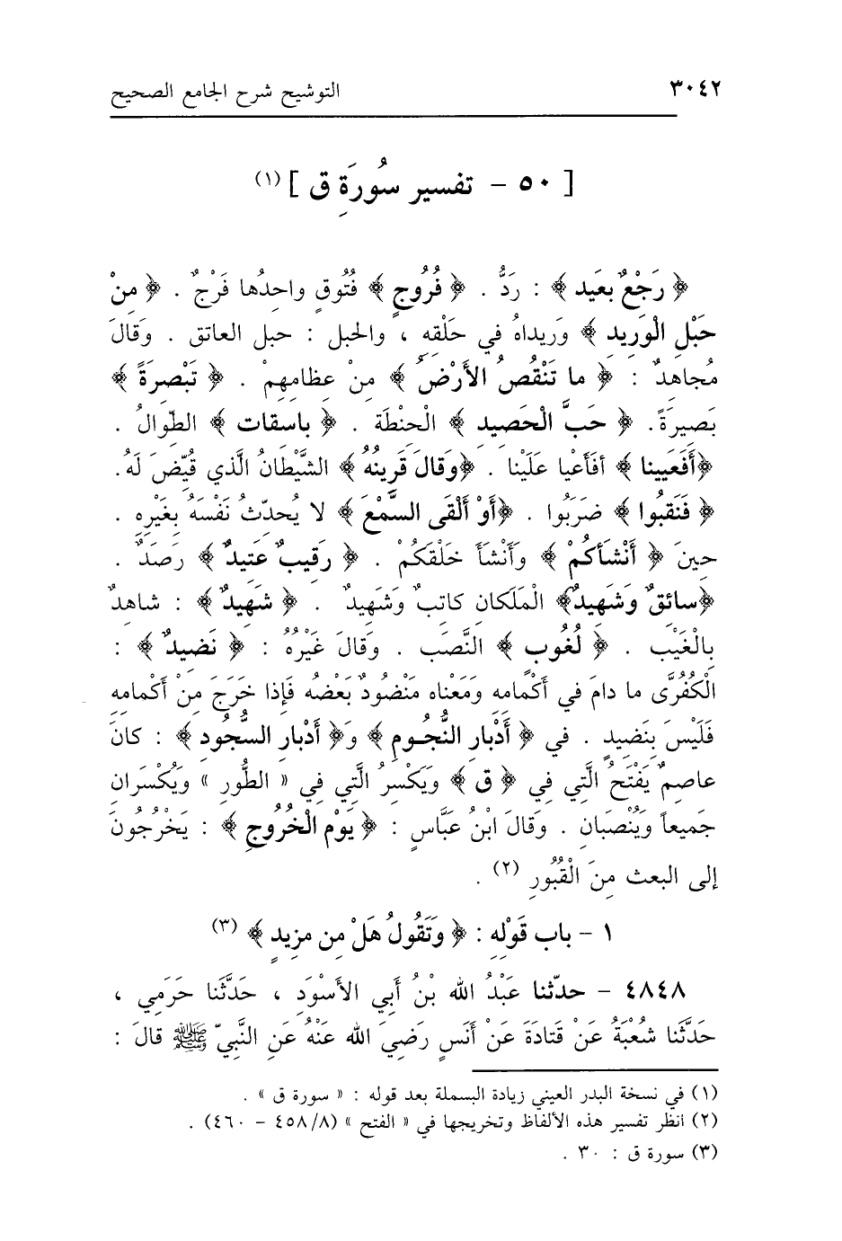 {رَجْعٌ بَعِيدٌ} [ق: 3]: «رَدٌّ»، {فُرُوجٍ} [ق: 6]: «فُتُوقٍ، وَاحِدُهَا فَرْجٌ»، {مِنْ حَبْلِ الوَرِيدِ} [ق: 16]: " وَرِيدَاهُ فِي حَلْقِهِ، وَالحَبْلُ: حَبْلُ العَاتِقِ " وَقَالَ مُجَاهِدٌ: {مَا تَنْقُصُ الأَرْضُ} [ق: 4]: «مِنْ عِظَامِهِمْ»، {تَبْصِرَةً} [ق: 8]: «بَصِيرَةً»، {حَبَّ الحَصِيدِ} [ق: 9]: «الحِنْطَةُ»، {بَاسِقَاتٍ} [ق: 10]: «الطِّوَالُ»، {أَفَعَيِينَا} [ق: 15]: «أَفَأَعْيَا عَلَيْنَا، حِينَ أَنْشَأَكُمْ وَأَنْشَأَ خَلْقَكُمْ»، {وَقَالَ قَرِينُهُ} [ق: 23]: «الشَّيْطَانُ الَّذِي قُيِّضَ لَهُ»، {فَنَقَّبُوا} [ق: 36]: «ضَرَبُوا»، {أَوْ أَلْقَى السَّمْعَ} [ق: 37]: «لاَ يُحَدِّثُ نَفْسَهُ بِغَيْرِهِ»، {رَقِيبٌ عَتِيدٌ} [ق: 18]: «رَصَدٌ»، {سَائِقٌ وَشَهِيدٌ} [ق: 21]: " المَلَكَانِ: كَاتِبٌ وَشَهِيدٌ "، {شَهِيدٌ} [البقرة: 282]: " شَاهِدٌ بِالْغَيْبِ، مِنْ {لُغُوبٍ} [فاطر: 35]: النَّصَبُ " وَقَالَ غَيْرُهُ: {نَضِيدٌ} [ق: 10]: " الكُفُرَّى مَا دَامَ فِي أَكْمَامِهِ، وَمَعْنَاهُ: مَنْضُودٌ بَعْضُهُ عَلَى بَعْضٍ، فَإِذَا خَرَجَ مِنْ أَكْمَامِهِ فَلَيْسَ بِنَضِيدٍ "، {وَإِدْبَارِ النُّجُومِ} [الطور: 49]، {وَأَدْبَارِ السُّجُودِ} [ق: 40]: «كَانَ عَاصِمٌ يَفْتَحُ الَّتِي فِي ق وَيَكْسِرُ الَّتِي فِي الطُّورِ، وَيُكْسَرَانِ جَمِيعًا وَيُنْصَبَانِ» وَقَالَ ابْنُ عَبَّاسٍ: {يَوْمَ الخُرُوجِ} [ق: 42]: «يَوْمَ يَخْرُجُونَ إِلَى البَعْثِ مِنَ القُبُورِ».