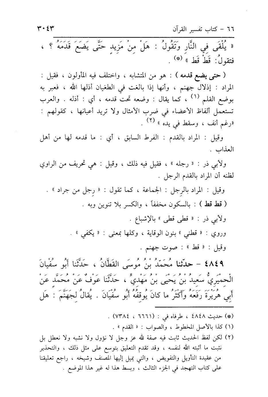 "يُلْقَى فِي النَّارِ وَتَقُولُ: هَلْ مِنْ مَزِيدٍ، حَتَّى يَضَعَ قَدَمَهُ، فَتَقُولُ قَطْ قَطْ".