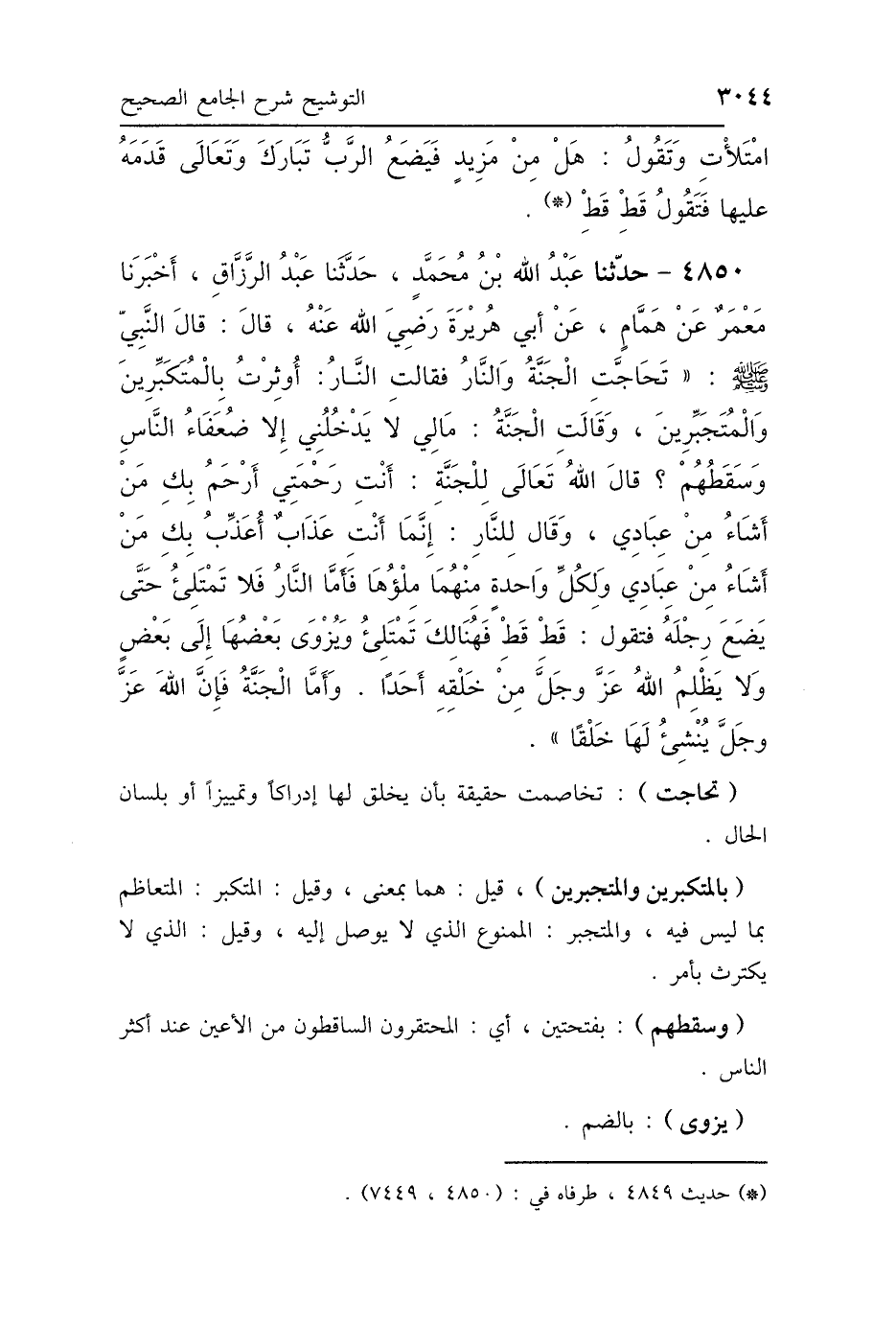 4850 - حَدَّثَنَا عَبْدُ اللَّهِ بْنُ مُحَمَّدٍ، حَدَّثَنَا عَبْدُ الرَّزَّاقِ، أَخْبَرَنَا مَعْمَرٌ، عَنْ هَمَّامٍ، عَنْ أَبِي هُرَيْرَةَ رَضِيَ اللَّهُ عَنْهُ، قَالَ: قَالَ النَّبِيُّ صَلَّى اللهُ عَلَيْهِ وَسَلَّمَ " تَحَاجَّتِ الجَنَّةُ وَالنَّارُ، فَقَالَتِ النَّارُ: أُوثِرْتُ بِالْمُتَكَبِّرِينَ وَالمُتَجَبِّرِينَ، وَقَالَتِ الجَنَّةُ: مَا لِي لاَ يَدْخُلُنِي إِلَّا ضُعَفَاءُ النَّاسِ وَسَقَطُهُمْ، قَالَ اللَّهُ تَبَارَكَ وَتَعَالَى لِلْجَنَّةِ: أَنْتِ رَحْمَتِي أَرْحَمُ بِكِ مَنْ أَشَاءُ مِنْ عِبَادِي، وَقَالَ لِلنَّارِ: إِنَّمَا أَنْتِ عَذَابِي أُعَذِّبُ بِكِ مَنْ أَشَاءُ مِنْ عِبَادِي، وَلِكُلِّ وَاحِدَةٍ مِنْهُمَا مِلْؤُهَا، فَأَمَّا النَّارُ: فَلاَ تَمْتَلِئُ حَتَّى يَضَعَ رِجْلَهُ فَتَقُولُ: قَطْ قَطْ، فَهُنَالِكَ تَمْتَلِئُ وَيُزْوَى بَعْضُهَا إِلَى بَعْضٍ، وَلاَ يَظْلِمُ اللَّهُ عَزَّ وَجَلَّ مِنْ خَلْقِهِ أَحَدًا، وَأَمَّا الجَنَّةُ: فَإِنَّ اللَّهَ عَزَّ وَجَلَّ يُنْشِئُ لَهَا خَلْقًا".