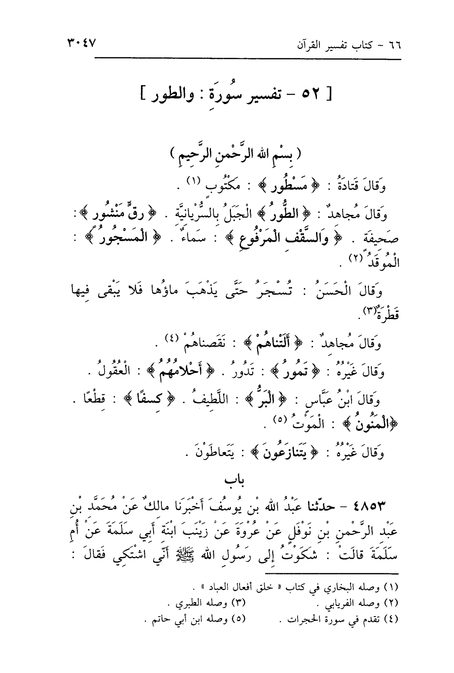 وَقَالَ قَتَادَةُ: {مَسْطُورٍ} [الطور: 2]: «مَكْتُوبٍ» وَقَالَ مُجَاهِدٌ: " الطُّورُ: الجَبَلُ بِالسُّرْيَانِيَّةِ، {رَقٍّ مَنْشُورٍ} [الطور: 3]: صَحِيفَةٍ، {وَالسَّقْفِ المَرْفُوعِ} [الطور: 5]: سَمَاءٌ، {المَسْجُورِ} [الطور: 6]: المُوقَدِ " وَقَالَ الحَسَنُ: «تُسْجَرُ حَتَّى يَذْهَبَ مَاؤُهَا فَلاَ يَبْقَى فِيهَا قَطْرَةٌ» وَقَالَ مُجَاهِدٌ: {أَلَتْنَاهُمْ} [الطور: 21]: «نَقَصْنَا» وَقَالَ غَيْرُهُ: {تَمُورُ} [الطور: 9]: «تَدُورُ»، {أَحْلاَمُهُمْ} [الطور: 32]: «العُقُولُ» وَقَالَ ابْنُ عَبَّاسٍ: {البَرُّ} [البقرة: 177]: «اللَّطِيفُ»، {كِسْفًا} [الإسراء: 92]: «قِطْعًا»، {المَنُونُ} [الطور: 30]: «المَوْتُ» وَقَالَ غَيْرُهُ: {يَتَنَازَعُونَ} [الكهف: 21]: «يَتَعَاطَوْنَ».
