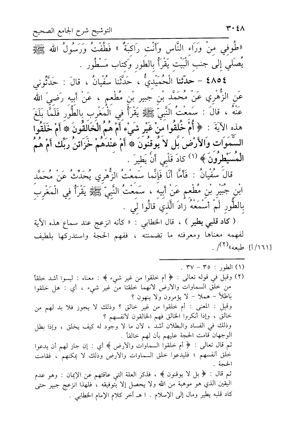 4854 - حَدَّثَنَا الحُمَيْدِيُّ، حَدَّثَنَا سُفْيَانُ، قَالَ: حَدَّثُونِي عَنِ الزُّهْرِيِّ، عَنْ مُحَمَّدِ بْنِ جُبَيْرِ بْنِ مُطْعِمٍ، عَنْ أَبِيهِ رَضِيَ اللَّهُ عَنْهُ، قَالَ: " سَمِعْتُ النَّبِيَّ صَلَّى اللهُ عَلَيْهِ وَسَلَّمَ يَقْرَأُ فِي المَغْرِبِ بِالطُّورِ، فَلَمَّا بَلَغَ هَذِهِ الآيَةَ: {أَمْ خُلِقُوا مِنْ غَيْرِ شَيْءٍ أَمْ هُمُ الخَالِقُونَ، أَمْ خَلَقُوا السَّمَوَاتِ وَالأَرْضَ بَلْ لاَ يُوقِنُونَ، أَمْ عِنْدَهُمْ خَزَائِنُ رَبِّكَ أَمْ هُمُ المُسَيْطِرُونَ} " قَالَ: كَادَ قَلْبِي أَنْ يَطِيرَ، قَالَ سُفْيَانُ: فَأَمَّا أَنَا، فَإِنَّمَا سَمِعْتُ الزُّهْرِيَّ يُحَدِّثُ، عَنْ مُحَمَّدِ بْنِ جُبَيْرِ بْنِ مُطْعِمٍ، عَنْ أَبِيهِ، سَمِعْتُ النَّبِيَّ صَلَّى اللهُ عَلَيْهِ وَسَلَّمَ، يَقْرَأُ فِي المَغْرِبِ بِالطُّورِ وَلَمْ أَسْمَعْهُ زَادَ الَّذِي قَالُوا لِي.