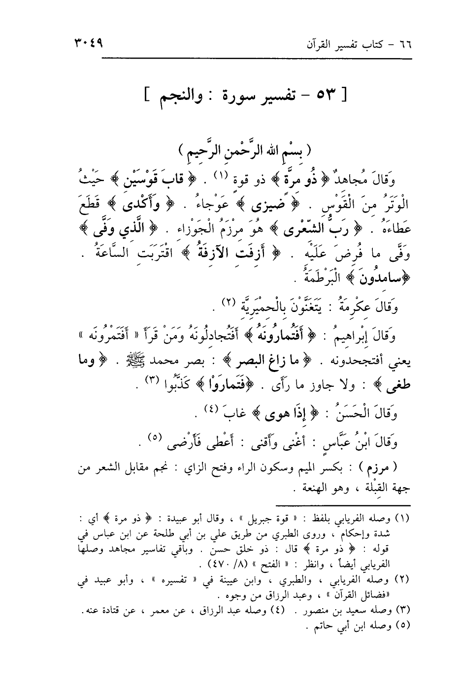 وَقَالَ مُجَاهِدٌ: {ذُو مِرَّةٍ} [النجم: 6]: «ذُو قُوَّةٍ»، {قَابَ قَوْسَيْنِ} [النجم: 9]: «حَيْثُ الوَتَرُ مِنَ القَوْسِ»، {ضِيزَى} [النجم: 22]: «عَوْجَاءُ»، {وَأَكْدَى} [النجم: 34]: «قَطَعَ عَطَاءَهُ»، {رَبُّ الشِّعْرَى} [النجم: 49]: «هُوَ مِرْزَمُ الجَوْزَاءِ»، {الَّذِي وَفَّى} [النجم: 37]: «وَفَّى مَا فُرِضَ عَلَيْهِ»، {أَزِفَتْ الآزِفَةُ} [النجم: 57]: «اقْتَرَبَتِ السَّاعَةُ»، {سَامِدُونَ} [النجم: 61]: «البَرْطَمَةُ» وَقَالَ عِكْرِمَةُ: «يَتَغَنَّوْنَ، بِالحِمْيَرِيَّةِ» وَقَالَ إِبْرَاهِيمُ: {أَفَتُمَارُونَهُ} [النجم: 12]: " أَفَتُجَادِلُونَهُ، وَمَنْ قَرَأَ: (أَفَتَمْرُونَهُ): يَعْنِي أَفَتَجْحَدُونَهُ " وَقَالَ: {مَا زَاغَ البَصَرُ} [النجم: 17]: «بَصَرُ مُحَمَّدٍ صَلَّى اللهُ عَلَيْهِ وَسَلَّمَ»، {وَمَا طَغَى} [النجم: 17]: «وَمَا جَاوَزَ مَا رَأَى»، {فَتَمَارَوْا} [القمر: 36]: «كَذَّبُوا» وَقَالَ الحَسَنُ: {إِذَا هَوَى} [النجم: 1]: «غَابَ» وَقَالَ ابْنُ عَبَّاسٍ: {أَغْنَى وَأَقْنَى} [النجم: 48]: «أَعْطَى فَأَرْضَ».