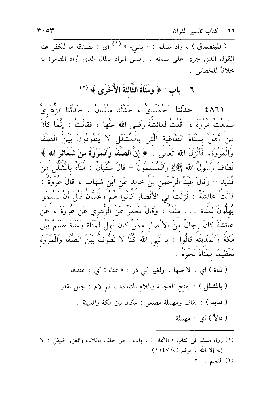 4861 - حَدَّثَنَا الحُمَيْدِيُّ، حَدَّثَنَا سُفْيَانُ، حَدَّثَنَا الزُّهْرِيُّ، سَمِعْتُ عُرْوَةَ، قُلْتُ لِعَائِشَةَ رَضِيَ اللَّهُ عَنْهَا فَقَالَتْ: " إِنَّمَا كَانَ مَنْ أَهَلَّ بِمَنَاةَ الطَّاغِيَةِ الَّتِي بِالْمُشَلَّلِ، لاَ يَطُوفُونَ بَيْنَ الصَّفَا وَالمَرْوَةِ، فَأَنْزَلَ اللَّهُ تَعَالَى: {إِنَّ الصَّفَا وَالمَرْوَةَ مِنْ شَعَائِرِ اللَّهِ} [البقرة: 158] فَطَافَ رَسُولُ اللَّهِ صَلَّى اللهُ عَلَيْهِ وَسَلَّمَ وَالمُسْلِمُونَ " قَالَ سُفْيَانُ: «مَنَاةُ بِالْمُشَلَّلِ مِنْ قُدَيْدٍ» وَقَالَ عَبْدُ الرَّحْمَنِ بْنُ خَالِدٍ، عَنِ ابْنِ شِهَابٍ، قَالَ عُرْوَةُ: قَالَتْ عَائِشَةُ: «نَزَلَتْ فِي الأَنْصَارِ، كَانُوا هُمْ وَغَسَّانُ قَبْلَ أَنْ يُسْلِمُوا يُهِلُّونَ لِمَنَاةَ مِثْلَهُ» وَقَالَ مَعْمَرٌ عَنِ الزُّهْرِيِّ، عَنْ عُرْوَةَ، عَنْ عَائِشَةَ، كَانَ رِجَالٌ مِنَ الأَنْصَارِ مِمَّنْ كَانَ يُهِلُّ لِمَنَاةَ - وَمَنَاةُ صَنَمٌ بَيْنَ مَكَّةَ وَالمَدِينَةِ - قَالُوا: «يَا نَبِيَّ اللَّهِ كُنَّا لاَ نَطُوفُ بَيْنَ الصَّفَا وَالمَرْوَةِ تَعْظِيمًا لِمَنَاةَ نَحْوَهُ».