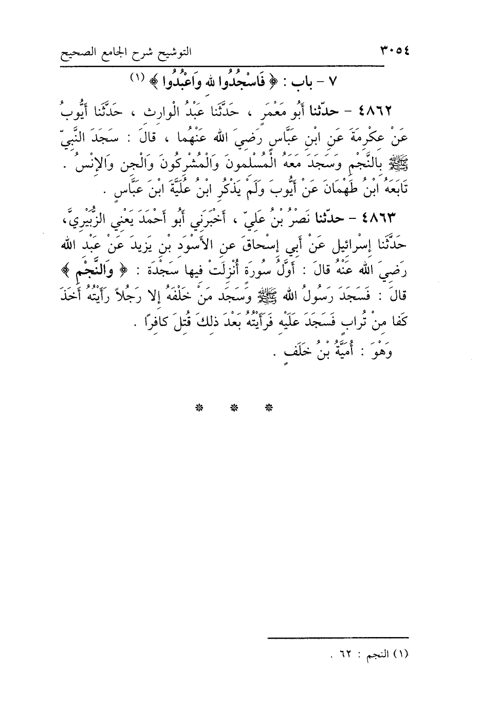 4862 - حَدَّثَنَا أَبُو مَعْمَرٍ، حَدَّثَنَا عَبْدُ الوَارِثِ، حَدَّثَنَا أَيُّوبُ، عَنْ عِكْرِمَةَ، عَنِ ابْنِ عَبَّاسٍ رَضِيَ اللَّهُ عَنْهُمَا، قَالَ: «سَجَدَ النَّبِيُّ صَلَّى اللهُ عَلَيْهِ وَسَلَّمَ بِالنَّجْمِ وَسَجَدَ مَعَهُ المُسْلِمُونَ وَالمُشْرِكُونَ وَالجِنُّ وَالإِنْسُ» تَابَعَهُ إِبْرَاهِيمُ بْنُ طَهْمَانَ، عَنْ أَيُّوبَ، وَلَمْ يَذْكُرِ ابْنُ عُلَيَّةَ ابْنَ عَبَّاسٍ.