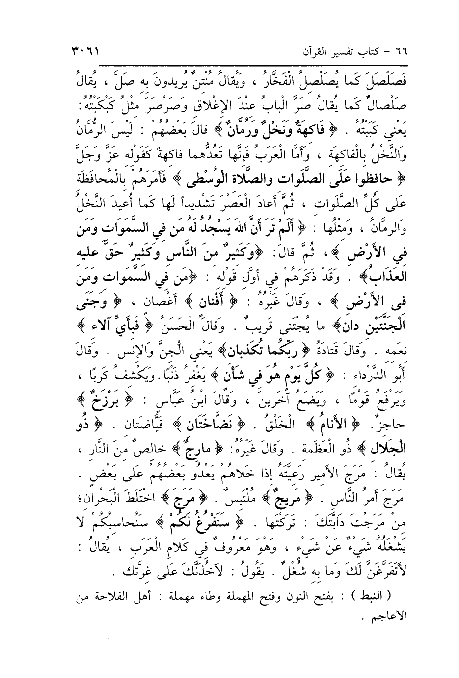 فَصَلْصَلَ كَمَا يُصَلْصِلُ الفَخَّارُ، وَيُقَالُ: مُنْتِنٌ، يُرِيدُونَ بِهِ: صَلَّ، يُقَالُ: صَلْصَالٌ كَمَا يُقَالُ: صَرَّ البَابُ عِنْدَ الإِغْلاَقِ وَصَرْصَرَ، مِثْلُ: كَبْكَبْتُهُ يَعْنِي كَبَبْتُهُ "، {فَاكِهَةٌ وَنَخْلٌ وَرُمَّانٌ} [الرحمن: 68]: " وَقَالَ بَعْضُهُمْ: لَيْسَ الرُّمَّانُ وَالنَّخْلُ بِالفَاكِهَةِ، وَأَمَّا العَرَبُ فَإِنَّهَا تَعُدُّهَا فَاكِهَةً "، كَقَوْلِهِ عَزَّ وَجَلَّ: {حَافِظُوا عَلَى الصَّلَوَاتِ وَالصَّلاَةِ الوُسْطَى} [البقرة: 238]: " فَأَمَرَهُمْ بِالْمُحَافَظَةِ عَلَى كُلِّ الصَّلَوَاتِ، ثُمَّ أَعَادَ العَصْرَ تَشْدِيدًا لَهَا، كَمَا أُعِيدَ النَّخْلُ وَالرُّمَّانُ، وَمِثْلُهَا: {أَلَمْ تَرَ أَنَّ اللَّهَ يَسْجُدُ لَهُ مَنْ فِي السَّمَوَاتِ وَمَنْ فِي الأَرْضِ} ثُمَّ قَالَ: {وَكَثِيرٌ مِنَ النَّاسِ، وَكَثِيرٌ حَقَّ عَلَيْهِ العَذَابُ} [الحج: 18] وَقَدْ ذَكَرَهُمُ اللَّهُ عَزَّ وَجَلَّ فِي أَوَّلِ قَوْلِهِ: {مَنْ فِي السَّمَوَاتِ وَمَنْ فِي الأَرْضِ} " وَقَالَ غَيْرُهُ: {أَفْنَانٍ} [الرحمن: 48]: «أَغْصَانٍ»، {وَجَنَى الجَنَّتَيْنِ دَانٍ} [الرحمن: 54]: «مَا يُجْتَنَى قَرِيبٌ» وَقَالَ الحَسَنُ: {فَبِأَيِّ آلاَءِ} [النجم: 55]: «نِعَمِهِ» وَقَالَ قَتَادَةُ: {رَبِّكُمَا تُكَذِّبَانِ} [الرحمن: 13]: «يَعْنِي الجِنَّ وَالإِنْسَ» وَقَالَ أَبُو الدَّرْدَاءِ: {كُلَّ يَوْمٍ هُوَ فِي شَأْنٍ} [الرحمن: 29]: «يَغْفِرُ ذَنْبًا، وَيَكْشِفُ كَرْبًا، وَيَرْفَعُ قَوْمًا، وَيَضَعُ آخَرِينَ» وَقَالَ ابْنُ عَبَّاسٍ: {بَرْزَخٌ} [المؤمنون: 100]: " حَاجِزٌ الأَنَامُ: الخَلْقُ "، {نَضَّاخَتَانِ} [الرحمن: 66]: «فَيَّاضَتَانِ»، {ذُو الجَلاَلِ} [الرحمن: 27]: «ذُو العَظَمَةِ» وَقَالَ غَيْرُهُ: {مَارِجٌ} [الرحمن: 15]: " خَالِصٌ مِنَ النَّارِ، يُقَالُ: مَرَجَ الأَمِيرُ رَعِيَّتَهُ إِذَا خَلَّاهُمْ يَعْدُو بَعْضُهُمْ عَلَى بَعْضٍ، وَيُقَالُ: مَرَجَ أَمْرُ النَّاسِ " {مَرِيجٍ} [ق: 5]: «مُلْتَبِسٌ»، {مَرَجَ البَحْرَيْنِ} [الفرقان: 53]: «اخْتَلَطَ البَحْرَانِ مِنْ مَرَجْتَ دَابَّتَكَ تَرَكْتَهَا»، {سَنَفْرُغُ لَكُمْ} [الرحمن: 31]: " سَنُحَاسِبُكُمْ، لاَ يَشْغَلُهُ شَيْءٌ عَنْ شَيْءٍ، وَهُوَ مَعْرُوفٌ فِي كَلاَمِ العَرَبِ، يُقَالُ: لَأَتَفَرَّغَنَّ لَكَ، وَمَا بِهِ شُغْلٌ، يَقُولُ: لَآخُذَنَّكَ عَلَى غِرَّتِكَ ".