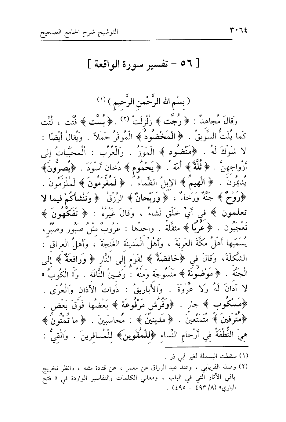 وَقَالَ مُجَاهِدٌ: {رُجَّتْ} [الواقعة: 4]: «زُلْزِلَتْ»، {بُسَّتْ} [الواقعة: 5]: " فُتَّتْ لُتَّتْ كَمَا يُلَتُّ السَّوِيقُ المَخْضُودُ: المُوقَرُ حَمْلًا، وَيُقَالُ أَيْضًا: لاَ شَوْكَ لَهُ " {مَنْضُودٍ} [هود: 82]: «المَوْزُ، وَالعُرُبُ المُحَبَّبَاتُ إِلَى أَزْوَاجِهِنَّ»، {ثُلَّةٌ} [الواقعة: 13]: «أُمَّةٌ»، {يَحْمُومٍ} [الواقعة: 43]: «دُخَانٌ أَسْوَدُ»، {يُصِرُّونَ} [الواقعة: 46]: «يُدِيمُونَ»، {الهِيمُ} [الواقعة: 55]: «الإِبِلُ الظِّمَاءُ»، {لَمُغْرَمُونَ} [الواقعة: 66]: «لَمَلُومُونَ مَدِينِينَ مُحَاسَبِينَ»، {رَوْحٌ} [يوسف: 87]: «جَنَّةٌ وَرَخَاءٌ»، {وَرَيْحَانٌ} [الواقعة: 89]: «الرَّيْحَانُ الرِّزْقُ»، {وَنُنْشِئَكُمْ فِيمَا لاَ تَعْلَمُونَ}: «فِي أَيِّ خَلْقٍ نَشَاءُ» وَقَالَ غَيْرُهُ: {تَفَكَّهُونَ} [الواقعة: 65]: «تَعْجَبُونَ»، {عُرُبًا} [الواقعة: 37]: «مُثَقَّلَةً، وَاحِدُهَا عَرُوبٌ، مِثْلُ صَبُورٍ وَصُبُرٍ، يُسَمِّيهَا أَهْلُ مَكَّةَ العَرِبَةَ، وَأَهْلُ المَدِينَةِ الغَنِجَةَ، وَأَهْلُ العِرَاقِ الشَّكِلَةَ»، وَقَالَ فِي {خَافِضَةٌ} [الواقعة: 3]: «لِقَوْمٍ إِلَى النَّارِ»، وَ {رَافِعَةٌ} [الواقعة: 3]: «إِلَى الجَنَّةِ»، {مَوْضُونَةٍ} [الواقعة: 15]: " مَنْسُوجَةٍ، وَمِنْهُ: وَضِينُ النَّاقَةِ وَالكُوبُ: لاَ آذَانَ لَهُ وَلاَ عُرْوَةَ وَالأَبَارِيقُ: ذَوَاتُ الآذَانِ وَالعُرَى "، {مَسْكُوبٍ} [الواقعة: 31]: «جَارٍ»، {وَفُرُشٍ مَرْفُوعَةٍ} [الواقعة: 34]: «بَعْضُهَا فَوْقَ بَعْضٍ»، {مُتْرَفِينَ} [الواقعة: 45]: «مُمَتَّعِينَ»، {مَا تُمْنُونَ} [الواقعة: 58]: «مِنَ النُّطَفِ يَعْنِي هِيَ النُّطْفَةُ فِي أَرْحَامِ النِّسَاءِ»، {لِلْمُقْوِينَ} [الواقعة: 73]: «لِلْمُسَافِرِينَ، وَالقِيُّ
