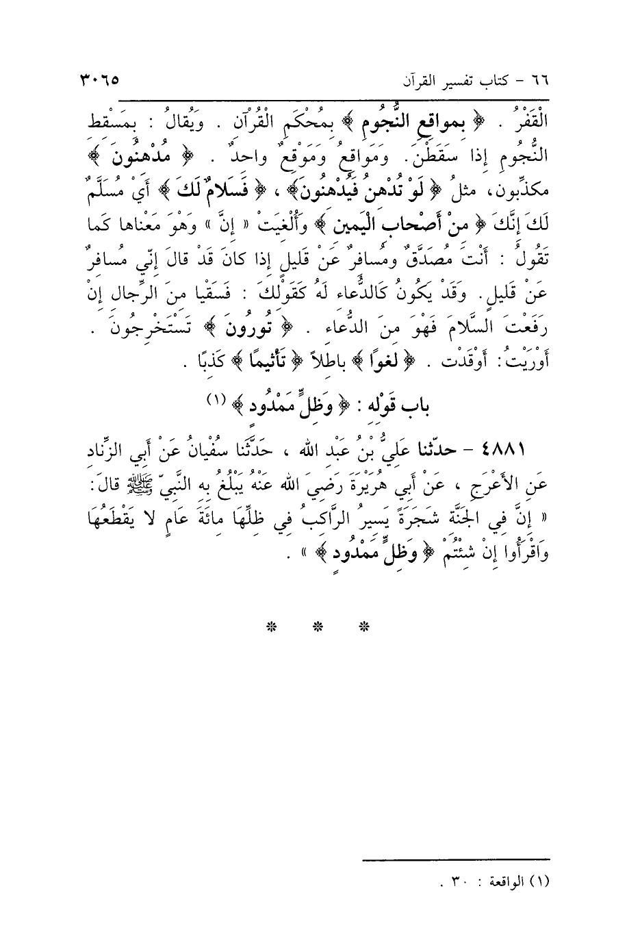 4881 - حَدَّثَنَا عَلِيُّ بْنُ عَبْدِ اللَّهِ، حَدَّثَنَا سُفْيَانُ، عَنْ أَبِي الزِّنَادِ، عَنِ الأَعْرَجِ، عَنْ أَبِي هُرَيْرَةَ رَضِيَ اللَّهُ عَنْهُ، يَبْلُغُ بِهِ النَّبِيَّ صَلَّى اللهُ عَلَيْهِ وَسَلَّمَ قَالَ: " إِنَّ فِي الجَنَّةِ شَجَرَةً، يَسِيرُ الرَّاكِبُ فِي ظِلِّهَا مِائَةَ عَامٍ، لاَ يَقْطَعُهَا، وَاقْرَءُوا إِنْ شِئْتُمْ: {وَظِلٍّ مَمْدُودٍ} [الواقعة: 30].