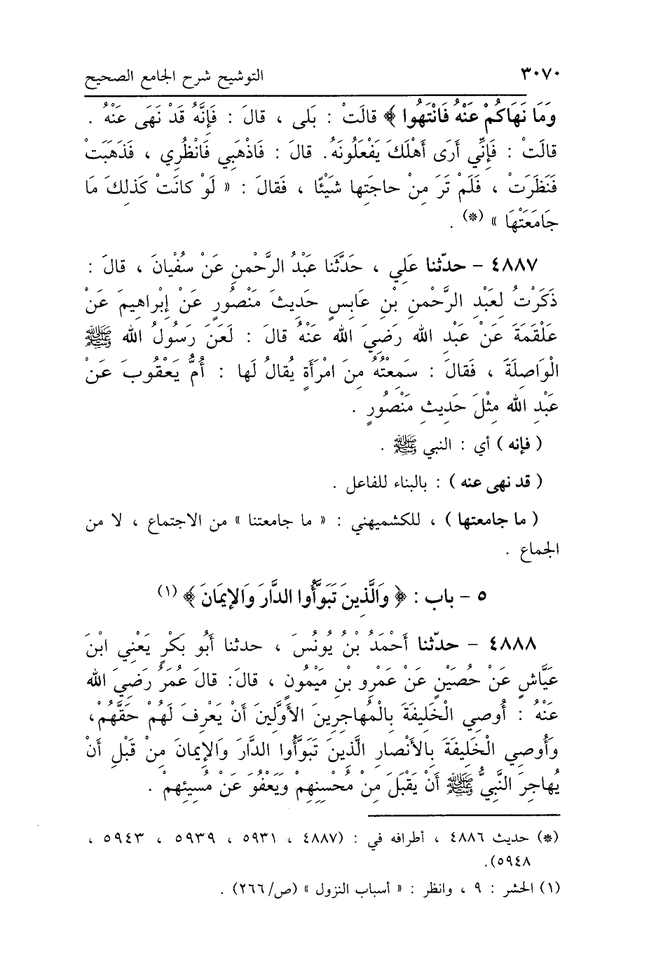 وَمَا نَهَاكُمْ عَنْهُ فَانْتَهُوا} [الحشر: 7]؟ قَالَتْ: بَلَى، قَالَ: فَإِنَّهُ قَدْ نَهَى عَنْهُ، قَالَتْ: فَإِنِّي أَرَى أَهْلَكَ يَفْعَلُونَهُ، قَالَ: فَاذْهَبِي فَانْظُرِي، فَذَهَبَتْ فَنَظَرَتْ، فَلَمْ تَرَ مِنْ حَاجَتِهَا شَيْئًا، فَقَالَ: لَوْ كَانَتْ كَذَلِكَ مَا جَامَعْتُهَا.