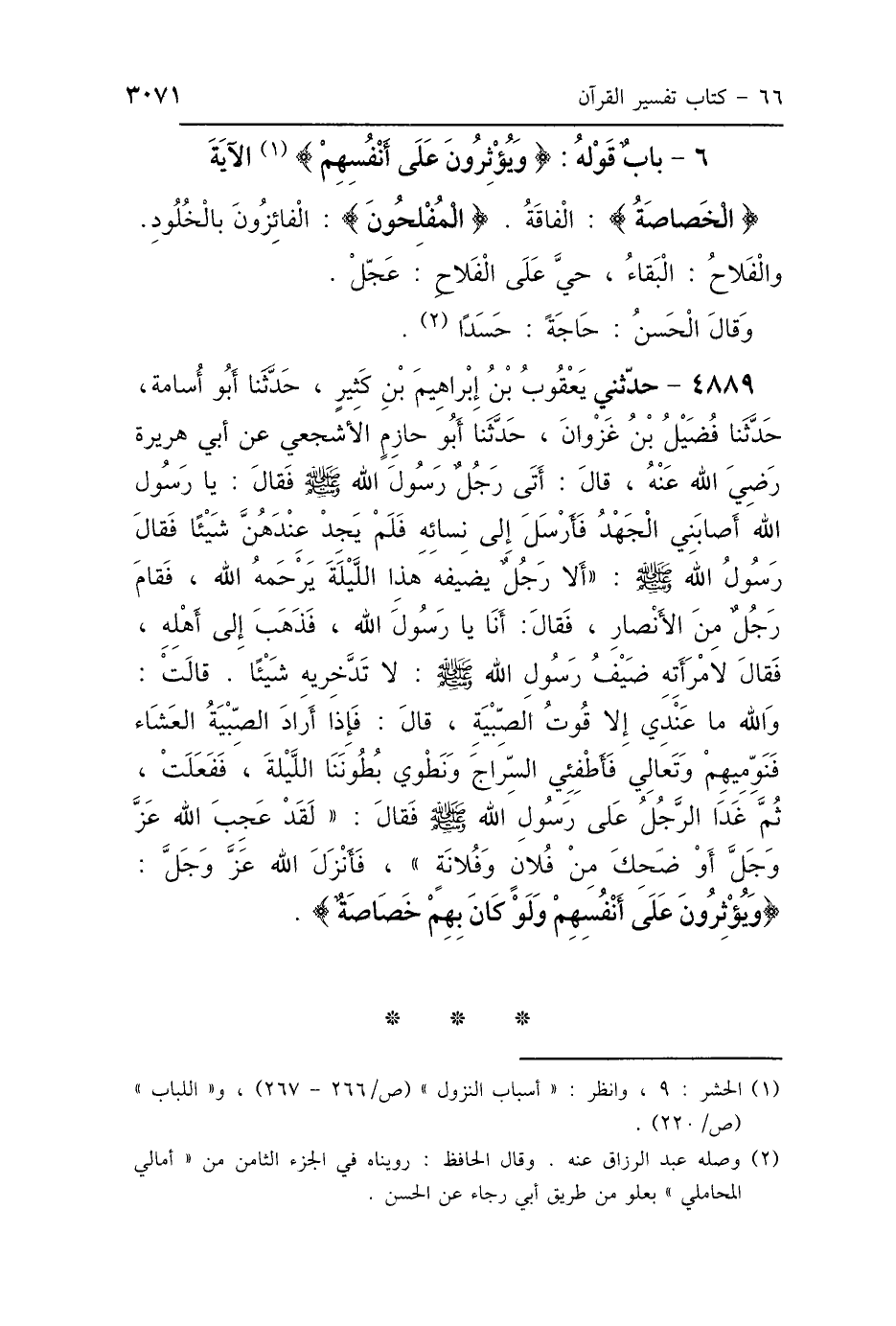 4889 - حَدَّثَنِي يَعْقُوبُ بْنُ إِبْرَاهِيمَ بْنِ كَثِيرٍ، حَدَّثَنَا أَبُو أُسَامَةَ، حَدَّثَنَا فُضَيْلُ بْنُ غَزْوَانَ، حَدَّثَنَا أَبُو حَازِمٍ الأَشْجَعِيُّ، عَنْ أَبِي هُرَيْرَةَ رَضِيَ اللَّهُ عَنْهُ، قَالَ: أَتَى رَجُلٌ رَسُولَ اللَّهِ صَلَّى اللهُ عَلَيْهِ وَسَلَّمَ، فَقَالَ: يَا رَسُولَ اللَّهِ، أَصَابَنِي الجَهْدُ، فَأَرْسَلَ إِلَى نِسَائِهِ فَلَمْ يَجِدْ عِنْدَهُنَّ شَيْئًا، فَقَالَ رَسُولُ اللَّهِ صَلَّى اللهُ عَلَيْهِ وَسَلَّمَ: «أَلاَ رَجُلٌ يُضَيِّفُهُ هَذِهِ اللَّيْلَةَ، يَرْحَمُهُ اللَّهُ؟» فَقَامَ رَجُلٌ مِنَ الأَنْصَارِ فَقَالَ: أَنَا يَا رَسُولَ اللَّهِ، فَذَهَبَ إِلَى أَهْلِهِ، فَقَالَ لِامْرَأَتِهِ: ضَيْفُ رَسُولِ اللَّهِ صَلَّى اللهُ عَلَيْهِ وَسَلَّمَ لاَ تَدَّخِرِيهِ شَيْئًا، قَالَتْ: وَاللَّهِ مَا عِنْدِي إِلَّا قُوتُ الصِّبْيَةِ، قَالَ: فَإِذَا أَرَادَ الصِّبْيَةُ العَشَاءَ فَنَوِّمِيهِمْ، وَتَعَالَيْ فَأَطْفِئِي السِّرَاجَ وَنَطْوِي بُطُونَنَا اللَّيْلَةَ، فَفَعَلَتْ، ثُمَّ غَدَا الرَّجُلُ عَلَى رَسُولِ اللَّهِ صَلَّى اللهُ عَلَيْهِ وَسَلَّمَ فَقَالَ: «لَقَدْ عَجِبَ اللَّهُ عَزَّ وَجَلَّ - أَوْ ضَحِكَ - مِنْ فُلاَنٍ وَفُلاَنَةَ» فَأَنْزَلَ اللَّهُ عَزَّ وَجَلَّ: {وَيُؤْثِرُونَ عَلَى أَنْفُسِهِمْ وَلَوْ كَانَ بِهِمْ خَصَاصَةٌ} [الحشر: 9].