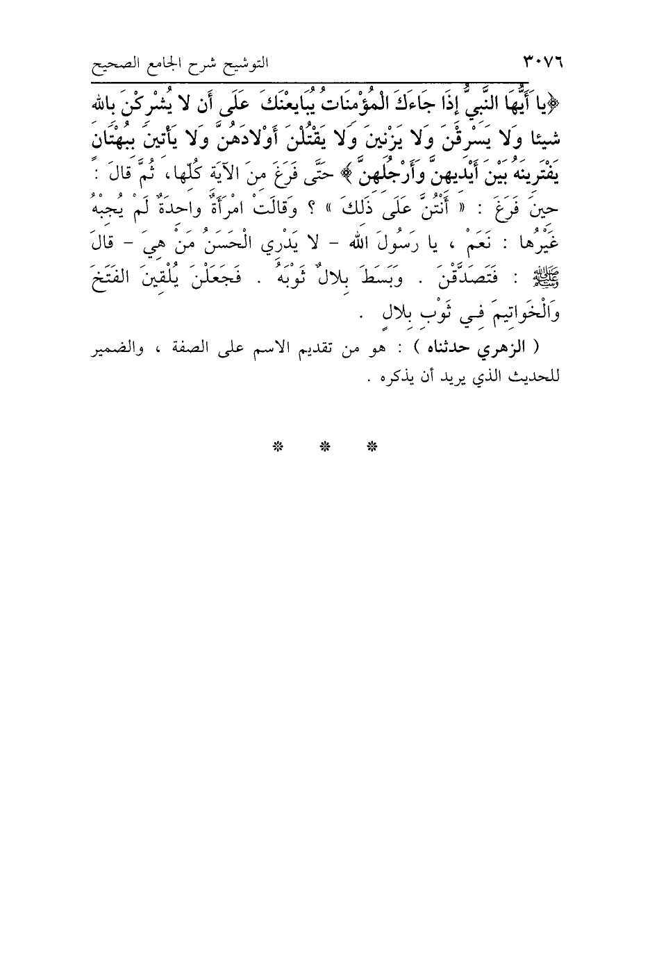 {يَا أَيُّهَا النَّبِيُّ إِذَا جَاءَكَ المُؤْمِنَاتُ يُبَايِعْنَكَ عَلَى أَنْ لاَ يُشْرِكْنَ بِاللَّهِ شَيْئًا، وَلاَ يَسْرِقْنَ وَلاَ يَزْنِينَ وَلاَ يَقْتُلْنَ أَوْلاَدَهُنَّ، وَلاَ يَأْتِينَ بِبُهْتَانٍ يَفْتَرِينَهُ بَيْنَ أَيْدِيهِنَّ وَأَرْجُلِهِنَّ} [الممتحنة: 12] حَتَّى فَرَغَ مِنَ الآيَةِ كُلِّهَا، ثُمَّ قَالَ حِينَ فَرَغَ: «أَنْتُنَّ عَلَى ذَلِكَ؟» فَقَالَتِ امْرَأَةٌ وَاحِدَةٌ، لَمْ يُجِبْهُ غَيْرُهَا: نَعَمْ يَا رَسُولَ اللَّهِ - لاَ يَدْرِي الحَسَنُ مَنْ هِيَ - قَالَ: «فَتَصَدَّقْنَ» وَبَسَطَ بِلاَلٌ ثَوْبَهُ، فَجَعَلْنَ يُلْقِينَ الفَتَخَ وَالخَوَاتِيمَ فِي ثَوْبِ بِلاَلٍ.