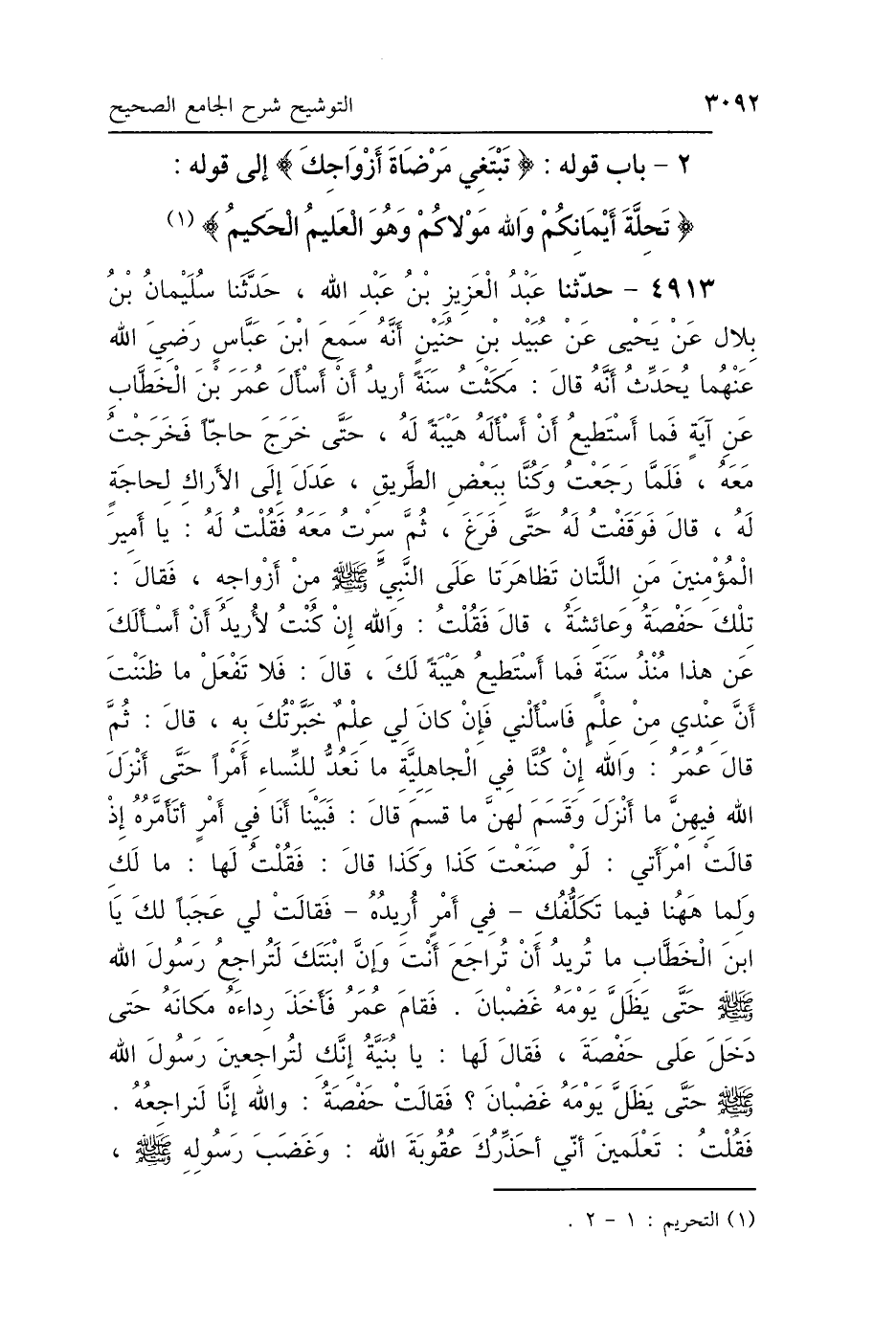 4913 - حَدَّثَنَا عَبْدُ العَزِيزِ بْنُ عَبْدِ اللَّهِ، حَدَّثَنَا سُلَيْمَانُ بْنُ بِلاَلٍ، عَنْ يَحْيَى، عَنْ عُبَيْدِ بْنِ حُنَيْنٍ، أَنَّهُ سَمِعَ ابْنَ عَبَّاسٍ رَضِيَ اللَّهُ عَنْهُمَا، يُحَدِّثُ أَنَّهُ قَالَ: مَكَثْتُ سَنَةً أُرِيدُ أَنْ أَسْأَلَ عُمَرَ بْنَ الخَطَّابِ عَنْ آيَةٍ، فَمَا أَسْتَطِيعُ أَنْ أَسْأَلَهُ هَيْبَةً لَهُ، حَتَّى خَرَجَ حَاجًّا فَخَرَجْتُ مَعَهُ، فَلَمَّا رَجَعْنَا وَكُنَّا بِبَعْضِ الطَّرِيقِ عَدَلَ إِلَى الأَرَاكِ لِحَاجَةٍ لَهُ، قَالَ: فَوَقَفْتُ لَهُ حَتَّى فَرَغَ ثُمَّ سِرْتُ مَعَهُ، فَقُلْتُ: يَا أَمِيرَ المُؤْمِنِينَ مَنِ اللَّتَانِ تَظَاهَرَتَا عَلَى النَّبِيِّ صَلَّى اللهُ عَلَيْهِ وَسَلَّمَ مِنْ أَزْوَاجِهِ؟ فَقَالَ: تِلْكَ حَفْصَةُ وَعَائِشَةُ، قَالَ: فَقُلْتُ: وَاللَّهِ إِنْ كُنْتُ لَأُرِيدُ أَنْ أَسْأَلَكَ عَنْ هَذَا مُنْذُ سَنَةٍ، فَمَا أَسْتَطِيعُ هَيْبَةً لَكَ، قَالَ: فَلاَ تَفْعَلْ مَا ظَنَنْتَ أَنَّ عِنْدِي مِنْ عِلْمٍ فَاسْأَلْنِي، فَإِنْ كَانَ لِي عِلْمٌ خَبَّرْتُكَ بِهِ، قَالَ: ثُمَّ قَالَ عُمَرُ: وَاللَّهِ إِنْ كُنَّا فِي الجَاهِلِيَّةِ مَا نَعُدُّ لِلنِّسَاءِ أَمْرًا، حَتَّى أَنْزَلَ اللَّهُ فِيهِنَّ مَا أَنْزَلَ، وَقَسَمَ لَهُنَّ مَا قَسَمَ، قَالَ: فَبَيْنَا أَنَا فِي أَمْرٍ أَتَأَمَّرُهُ، إِذْ قَالَتِ امْرَأَتِي: لَوْ صَنَعْتَ كَذَا وَكَذَا، قَالَ: فَقُلْتُ لَهَا: مَا لَكَ، وَلِمَا هَا هُنَا وَفِيمَ تَكَلُّفُكِ فِي أَمْرٍ أُرِيدُهُ، فَقَالَتْ لِي: عَجَبًا لَكَ يَا ابْنَ الخَطَّابِ، مَا تُرِيدُ أَنْ تُرَاجَعَ أَنْتَ وَإِنَّ ابْنَتَكَ لَتُرَاجِعُ رَسُولَ اللَّهِ صَلَّى اللهُ عَلَيْهِ وَسَلَّمَ حَتَّى يَظَلَّ يَوْمَهُ غَضْبَانَ، فَقَامَ عُمَرُ فَأَخَذَ رِدَاءَهُ مَكَانَهُ حَتَّى دَخَلَ عَلَى حَفْصَةَ، فَقَالَ لَهَا: يَا بُنَيَّةُ إِنَّكِ لَتُرَاجِعِينَ رَسُولَ اللَّهِ صَلَّى اللهُ عَلَيْهِ وَسَلَّمَ حَتَّى يَظَلَّ يَوْمَهُ غَضْبَانَ، فَقَالَتْ حَفْصَةُ: وَاللَّهِ إِنَّا لَنُرَاجِعُهُ، فَقُلْتُ: تَعْلَمِينَ أَنِّي أُحَذِّرُكِ عُقُوبَةَ اللَّهِ، وَغَضَبَ رَسُولِهِ صَلَّى اللهُ عَلَيْهِ وَسَلَّمَ،