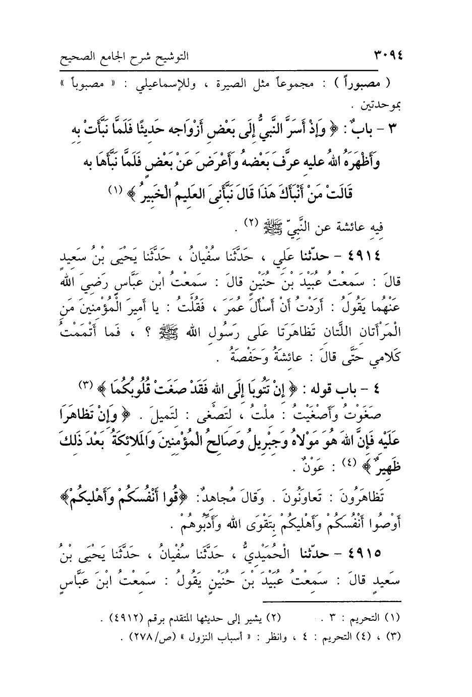 4 - بَابُ {إِنْ تَتُوبَا إِلَى اللَّهِ فَقَدْ صَغَتْ قُلُوبُكُمَا} [التحريم: 4]