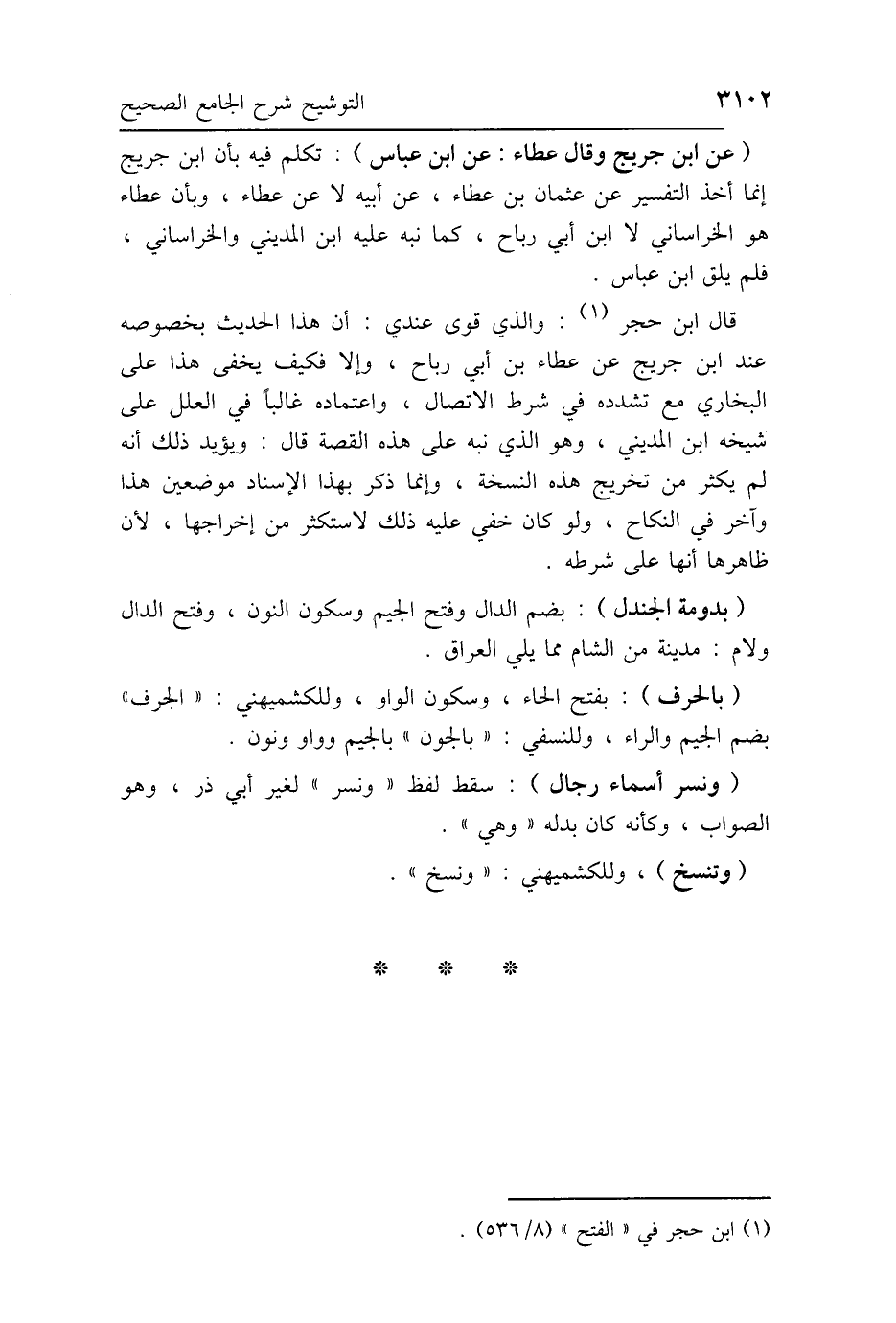 (عن ابن جريج وقال عطاء: عن ابن عباس): تكلم فيه بأن ابن جريج إنما أخذ التفسير عن عثمان بن عطاء، عن أبيه لا عن عطاء، وبأن عطاء هو الخراساني لا ابن أبي رباح، كما نبه عليه ابن المديني والخراساني، فلم يلق ابن عباس.