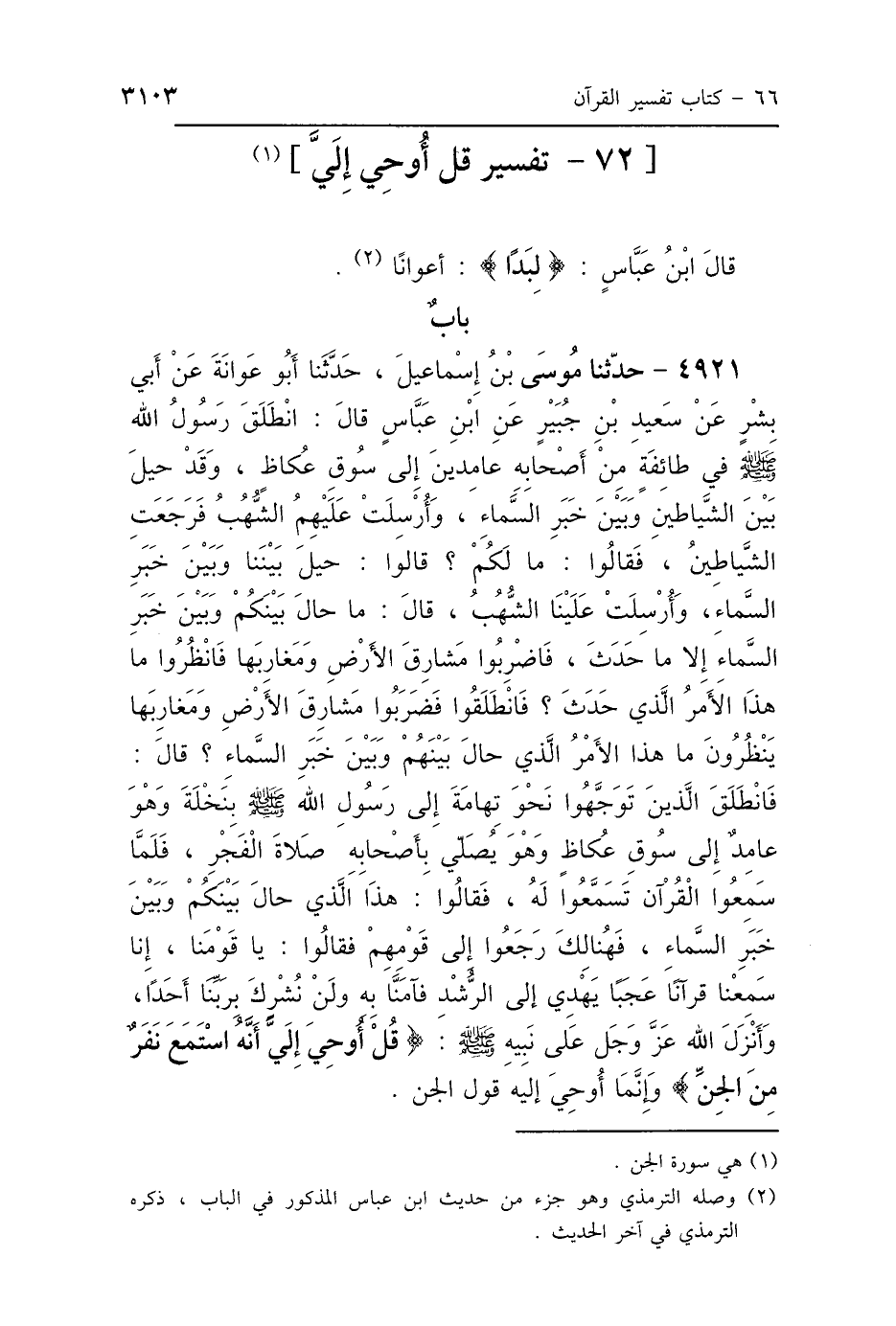 4921 - حَدَّثَنَا مُوسَى بْنُ إِسْمَاعِيلَ، حَدَّثَنَا أَبُو عَوَانَةَ، عَنْ أَبِي بِشْرٍ، عَنْ سَعِيدِ بْنِ جُبَيْرٍ، عَنِ ابْنِ عَبَّاسٍ، قَالَ: انْطَلَقَ رَسُولُ اللَّهِ صَلَّى اللهُ عَلَيْهِ وَسَلَّمَ فِي طَائِفَةٍ مِنْ أَصْحَابِهِ عَامِدِينَ إِلَى سُوقِ عُكَاظٍ وَقَدْ حِيلَ بَيْنَ الشَّيَاطِينِ وَبَيْنَ خَبَرِ السَّمَاءِ، وَأُرْسِلَتْ عَلَيْهِمُ الشُّهُبُ، فَرَجَعَتِ الشَّيَاطِينُ، فَقَالُوا: مَا لَكُمْ؟ فَقَالُوا: حِيلَ بَيْنَنَا وَبَيْنَ خَبَرِ السَّمَاءِ، وَأُرْسِلَتْ عَلَيْنَا الشُّهُبُ، قَالَ: مَا حَالَ بَيْنَكُمْ وَبَيْنَ خَبَرِ السَّمَاءِ إِلَّا مَا حَدَثَ، فَاضْرِبُوا مَشَارِقَ الأَرْضِ وَمَغَارِبَهَا، فَانْظُرُوا مَا هَذَا الأَمْرُ الَّذِي حَدَثَ، فَانْطَلَقُوا فَضَرَبُوا مَشَارِقَ الأَرْضِ وَمَغَارِبَهَا، يَنْظُرُونَ مَا هَذَا الأَمْرُ الَّذِي حَالَ بَيْنَهُمْ وَبَيْنَ خَبَرِ السَّمَاءِ، قَالَ: فَانْطَلَقَ الَّذِينَ تَوَجَّهُوا نَحْوَ تِهَامَةَ إِلَى رَسُولِ اللَّهِ صَلَّى اللهُ عَلَيْهِ وَسَلَّمَ بِنَخْلَةَ، «وَهُوَ عَامِدٌ إِلَى سُوقِ عُكَاظٍ وَهُوَ يُصَلِّي بِأَصْحَابِهِ صَلاَةَ الفَجْرِ فَلَمَّا سَمِعُوا القُرْآنَ تَسَمَّعُوا لَهُ»، فَقَالُوا: هَذَا الَّذِي حَالَ بَيْنَكُمْ وَبَيْنَ خَبَرِ السَّمَاءِ، فَهُنَالِكَ رَجَعُوا إِلَى قَوْمِهِمْ، فَقَالُوا: يَا قَوْمَنَا {إِنَّا سَمِعْنَا قُرْآنًا عَجَبًا، يَهْدِي إِلَى الرُّشْدِ فَآمَنَّا بِهِ وَلَنْ نُشْرِكَ بِرَبِّنَا أَحَدًا} [الجن: 2] " وَأَنْزَلَ اللَّهُ عَزَّ وَجَلَّ عَلَى نَبِيِّهِ صَلَّى اللهُ عَلَيْهِ وَسَلَّمَ: {قُلْ أُوحِيَ إِلَيَّ أَنَّهُ اسْتَمَعَ نَفَرٌ مِنَ الجِنِّ} [الجن: 1] وَإِنَّمَا أُوحِيَ إِلَيْهِ قَوْلُ الجِنِّ".