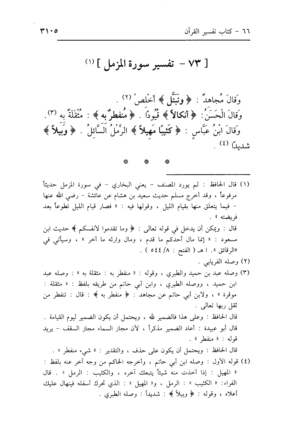 وَقَالَ مُجَاهِدٌ: {وَتَبَتَّلْ} [المزمل: 8]: «أَخْلِصْ» وَقَالَ الحَسَنُ: {أَنْكَالًا} [المزمل: 12]: «قُيُودًا»، {مُنْفَطِرٌ بِهِ} [المزمل: 18]: «مُثْقَلَةٌ بِهِ» وَقَالَ ابْنُ عَبَّاسٍ: {كَثِيبًا مَهِيلًا} [المزمل: 14]: «الرَّمْلُ السَّائِلُ وَبِيلًا شَدِيدًا».