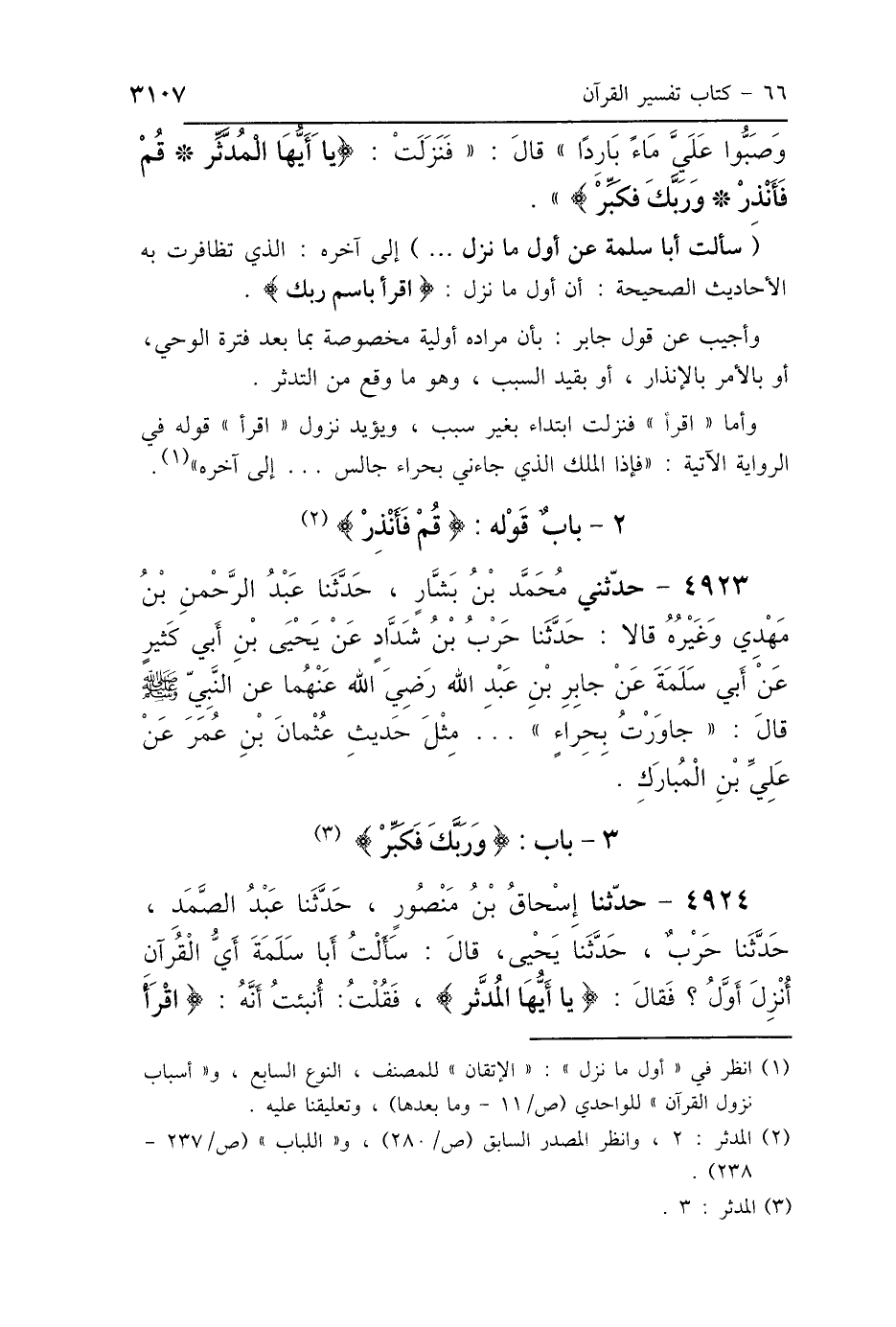 وَصَبُّوا عَلَيَّ مَاءً بَارِدًا، قَالَ: فَنَزَلَتْ: {يَا أَيُّهَا المُدَّثِّرُ قُمْ فَأَنْذِرْ وَرَبَّكَ فَكَبِّرْ} [المدثر: 2].