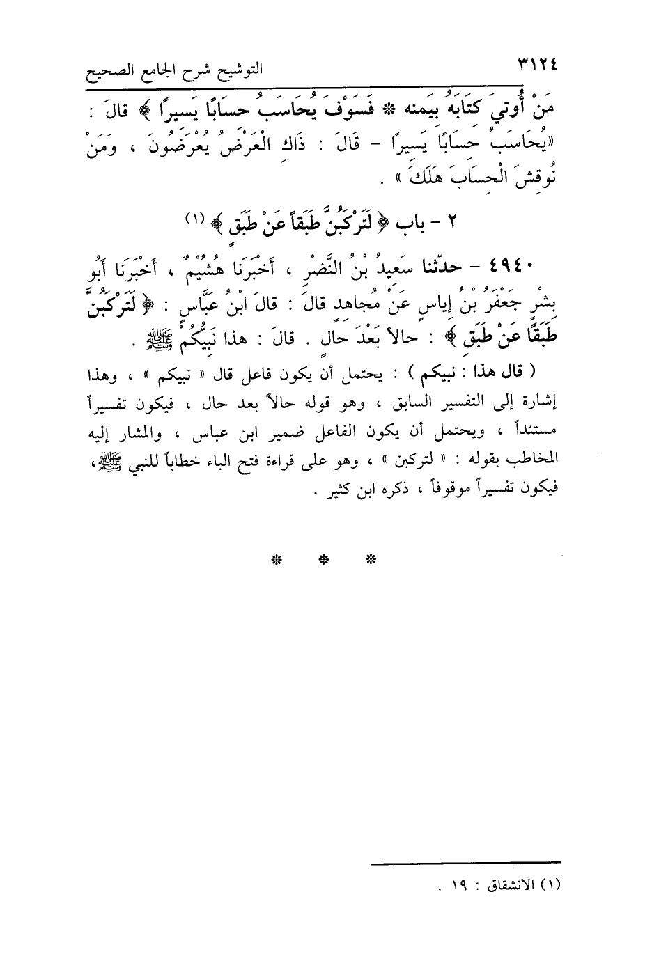 4940 - حَدَّثَنِي سَعِيدُ بْنُ النَّضْرِ، أَخْبَرَنَا هُشَيْمٌ، أَخْبَرَنَا أَبُو بِشْرٍ جَعْفَرُ بْنُ إِيَاسٍ، عَنْ مُجَاهِدٍ، قَالَ: قَالَ ابْنُ عَبَّاسٍ: {لَتَرْكَبُنَّ طَبَقًا عَنْ طَبَقٍ} [الانشقاق: 19] «حَالًا بَعْدَ حَالٍ»، قَالَ: «هَذَا نَبِيُّكُمْ صَلَّى اللهُ عَلَيْهِ وَسَلَّمَ».
