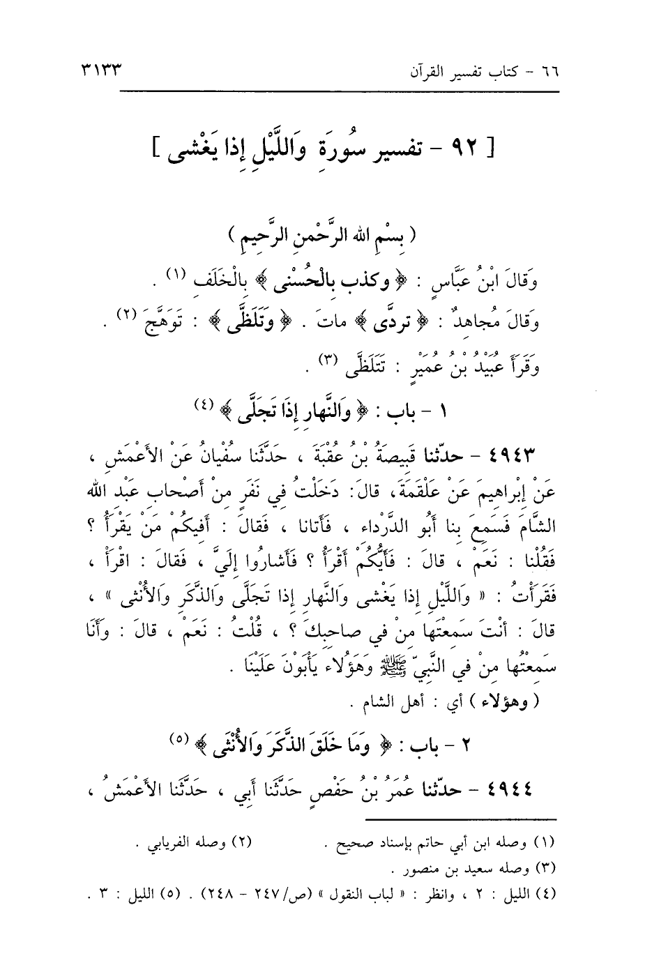 4943 - حَدَّثَنَا قَبِيصَةُ بْنُ عُقْبَةَ، حَدَّثَنَا سُفْيَانُ، عَنِ الأَعْمَشِ، عَنْ إِبْرَاهِيمَ، عَنْ عَلْقَمَةَ، قَالَ: دَخَلْتُ فِي نَفَرٍ مِنْ أَصْحَابِ عَبْدِ اللَّهِ الشَّأْمَ فَسَمِعَ بِنَا أَبُو الدَّرْدَاءِ، فَأَتَانَا فَقَالَ: أَفِيكُمْ مَنْ يَقْرَأُ؟ فَقُلْنَا: نَعَمْ، قَالَ: فَأَيُّكُمْ أَقْرَأُ؟ فَأَشَارُوا إِلَيَّ، فَقَالَ: اقْرَأْ، فَقَرَأْتُ: {وَاللَّيْلِ إِذَا يَغْشَى، وَالنَّهَارِ إِذَا تَجَلَّى} [الليل: 2]، وَالذَّكَرِ وَالأُنْثَى، قَالَ: أَنْتَ سَمِعْتَهَا مِنْ فِي صَاحِبِكَ؟ قُلْتُ: نَعَمْ، قَالَ: «وَأَنَا سَمِعْتُهَا مِنْ فِي النَّبِيِّ صَلَّى اللهُ عَلَيْهِ وَسَلَّمَ»، وَهَؤُلاَءِ يَأْبَوْنَ عَلَيْنَا.