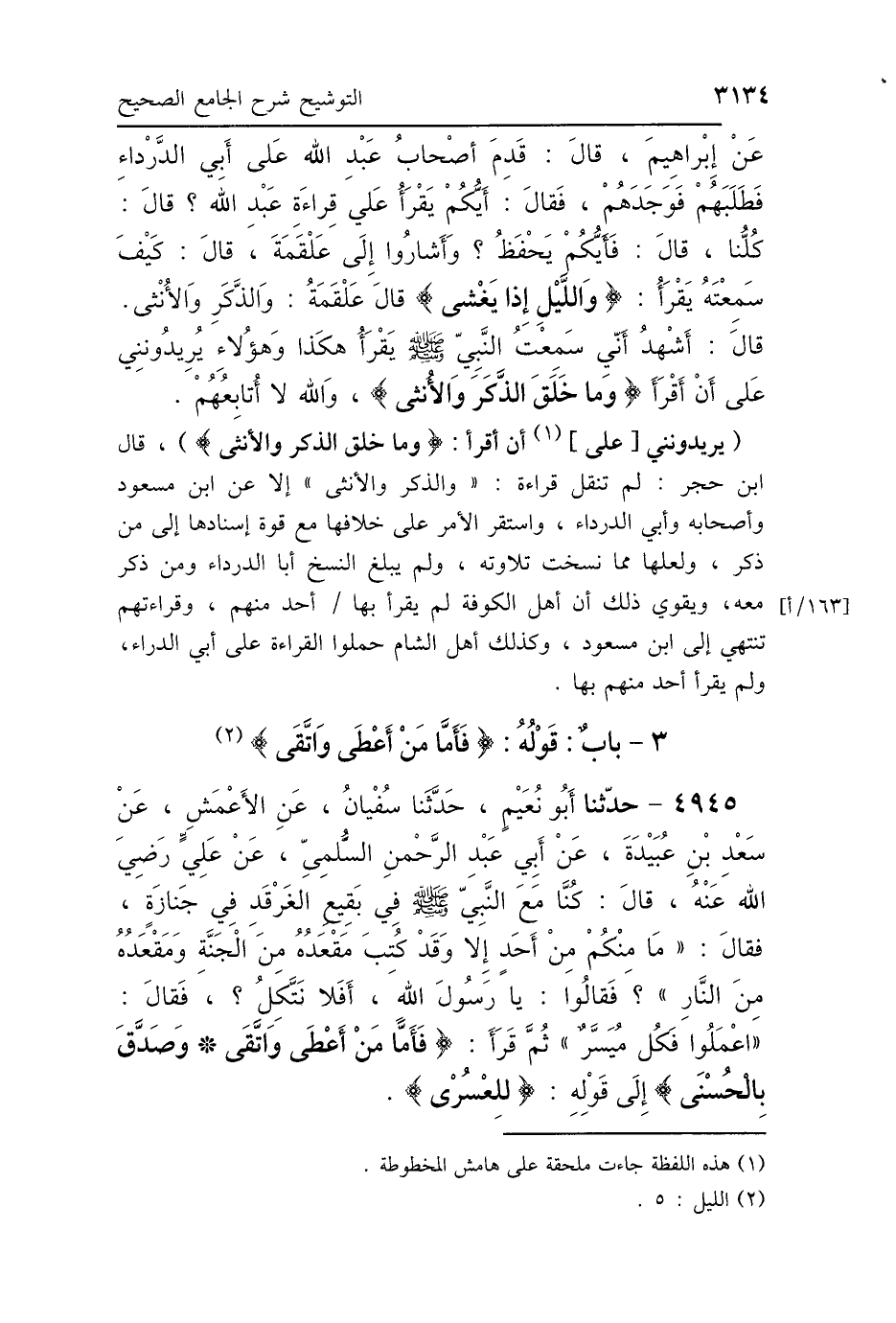 عَنْ إِبْرَاهِيمَ، قَالَ: قَدِمَ أَصْحَابُ عَبْدِ اللَّهِ عَلَى أَبِي الدَّرْدَاءِ فَطَلَبَهُمْ فَوَجَدَهُمْ، فَقَالَ: أَيُّكُمْ يَقْرَأُ عَلَى قِرَاءَةِ عَبْدِ اللَّهِ؟ قَالَ: كُلُّنَا، قَالَ: فَأَيُّكُمْ أَحْفَظُ؟ فَأَشَارُوا إِلَى عَلْقَمَةَ، قَالَ: كَيْفَ سَمِعْتَهُ يَقْرَأُ: {وَاللَّيْلِ إِذَا يَغْشَى} [الليل: 1]؟ قَالَ عَلْقَمَةُ: وَالذَّكَرِ وَالأُنْثَى، قَالَ: «أَشْهَدُ أَنِّي سَمِعْتُ النَّبِيَّ صَلَّى اللهُ عَلَيْهِ وَسَلَّمَ يَقْرَأُ هَكَذَا»، وَهَؤُلاَءِ يُرِيدُونِي عَلَى أَنْ أَقْرَأَ: {وَمَا خَلَقَ الذَّكَرَ وَالأُنْثَى} [الليل: 3] وَاللَّهِ لاَ أُتَابِعُهُمْ.