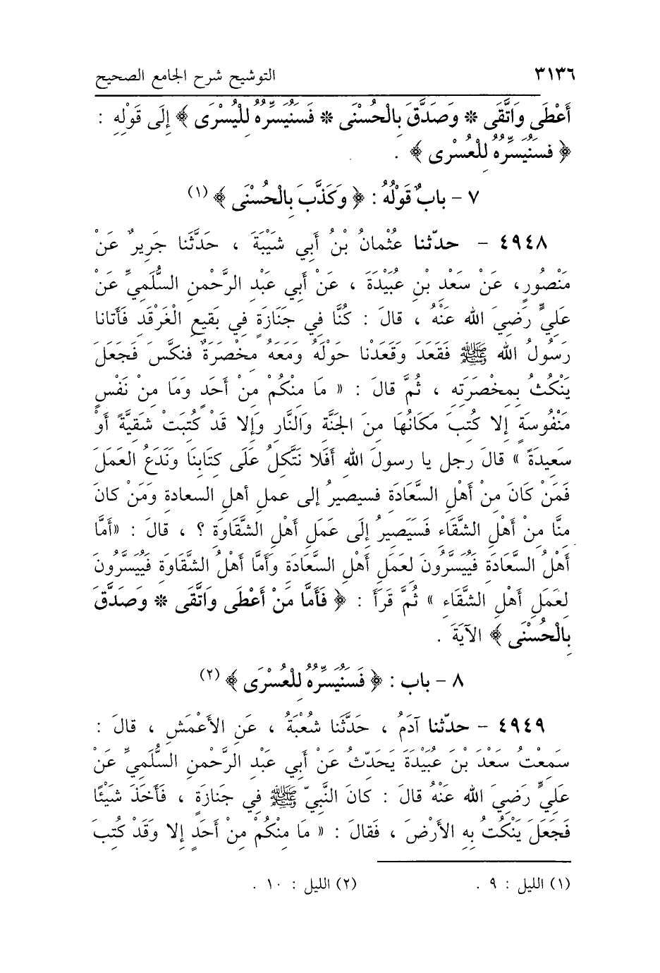 4948 - حَدَّثَنَا عُثْمَانُ بْنُ أَبِي شَيْبَةَ، حَدَّثَنَا جَرِيرٌ، عَنْ مَنْصُورٍ، عَنْ سَعْدِ بْنِ عُبَيْدَةَ، عَنْ أَبِي عَبْدِ الرَّحْمَنِ السُّلَمِيِّ، عَنْ عَلِيٍّ رَضِيَ اللَّهُ عَنْهُ، قَالَ: كُنَّا فِي جَنَازَةٍ فِي بَقِيعِ الغَرْقَدِ فَأَتَانَا رَسُولُ اللَّهِ صَلَّى اللهُ عَلَيْهِ وَسَلَّمَ، فَقَعَدَ وَقَعَدْنَا حَوْلَهُ، وَمَعَهُ مِخْصَرَةٌ فَنَكَّسَ فَجَعَلَ يَنْكُتُ بِمِخْصَرَتِهِ، ثُمَّ قَالَ: «مَا مِنْكُمْ مِنْ أَحَدٍ وَمَا مِنْ نَفْسٍ مَنْفُوسَةٍ إِلَّا كُتِبَ مَكَانُهَا مِنَ الجَنَّةِ وَالنَّارِ، وَإِلَّا قَدْ كُتِبَتْ شَقِيَّةً أَوْ سَعِيدَةً» قَالَ رَجُلٌ: يَا رَسُولَ اللَّهِ، أَفَلاَ نَتَّكِلُ عَلَى كِتَابِنَا، وَنَدَعُ العَمَلَ؟ فَمَنْ كَانَ مِنَّا مِنْ أَهْلِ السَّعَادَةِ، فَسَيَصِيرُ إِلَى عَمَلِ أَهْلِ السَّعَادَةِ، وَمَنْ كَانَ مِنَّا مِنْ أَهْلِ الشَّقَاءِ، فَسَيَصِيرُ إِلَى عَمَلِ أَهْلِ الشَّقَاوَةِ، قَالَ: «أَمَّا أَهْلُ السَّعَادَةِ فَيُيَسَّرُونَ لِعَمَلِ أَهْلِ السَّعَادَةِ، وَأَمَّا أَهْلُ الشَّقَاوَةِ فَيُيَسَّرُونَ لِعَمَلِ أَهْلِ الشَّقَاءِ»، ثُمَّ قَرَأَ: {فَأَمَّا مَنْ أَعْطَى وَاتَّقَى وَصَدَّقَ بِالحُسْنَى} [الليل: 6] الآيَةَ.