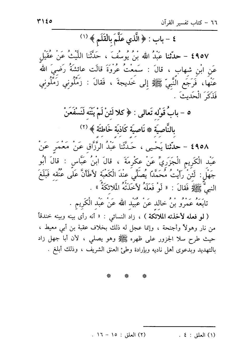 5 - بَابُ {كَلَّا لَئِنْ لَمْ يَنْتَهِ لَنَسْفَعَنْ بِالنَّاصِيَةِ نَاصِيَةٍ كَاذِبَةٍ خَاطِئَةٍ}