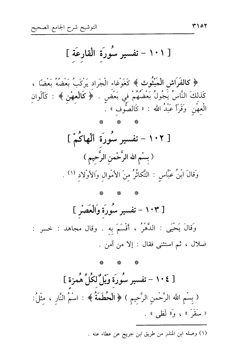 {كَالفَرَاشِ المَبْثُوثِ} [القارعة: 4]: «كَغَوْغَاءِ الجَرَادِ، يَرْكَبُ بَعْضُهُ بَعْضًا، كَذَلِكَ النَّاسُ يَجُولُ بَعْضُهُمْ فِي بَعْضٍ»، {كَالعِهْنِ} [المعارج: 9]: «كَأَلْوَانِ العِهْنِ» وَقَرَأَ عَبْدُ اللَّهِ: «كَالصُّوفِ».