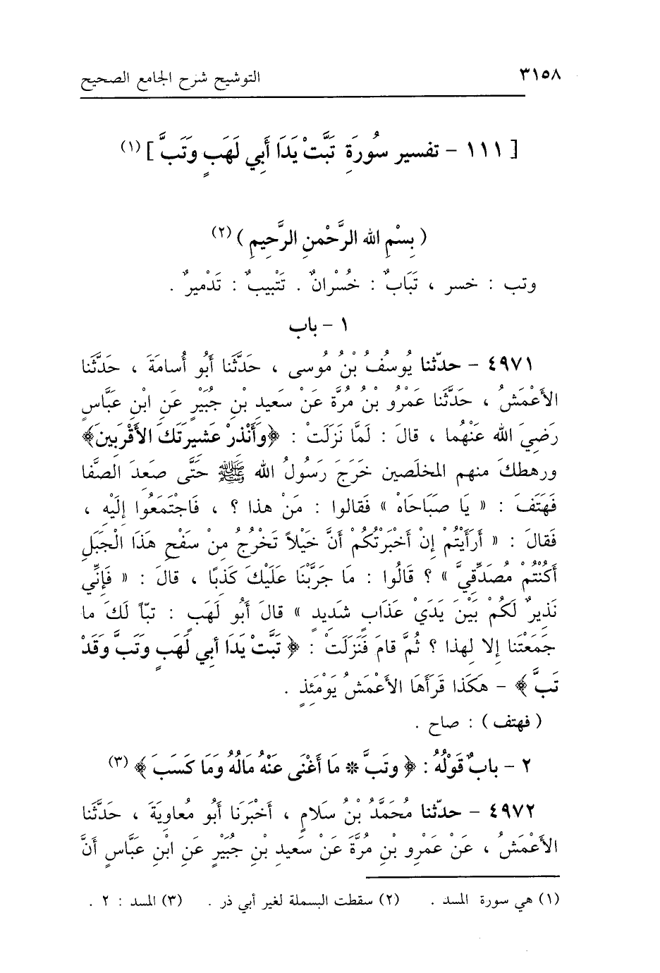 4971 - حَدَّثَنَا يُوسُفُ بْنُ مُوسَى، حَدَّثَنَا أَبُو أُسَامَةَ، حَدَّثَنَا الأَعْمَشُ، حَدَّثَنَا عَمْرُو بْنُ مُرَّةَ، عَنْ سَعِيدِ بْنِ جُبَيْرٍ، عَنِ ابْنِ عَبَّاسٍ رَضِيَ اللَّهُ عَنْهُمَا، قَالَ: لَمَّا نَزَلَتْ: {وَأَنْذِرْ عَشِيرَتَكَ الأَقْرَبِينَ} [الشعراء: 214] وَرَهْطَكَ مِنْهُمُ المُخْلَصِينَ، خَرَجَ رَسُولُ اللَّهِ صَلَّى اللهُ عَلَيْهِ وَسَلَّمَ حَتَّى صَعِدَ الصَّفَا فَهَتَفَ: «يَا صَبَاحَاهْ» فَقَالُوا: مَنْ هَذَا؟، فَاجْتَمَعُوا إِلَيْهِ، فَقَالَ: «أَرَأَيْتُمْ إِنْ أَخْبَرْتُكُمْ أَنَّ خَيْلًا تَخْرُجُ مِنْ سَفْحِ هَذَا الجَبَلِ، أَكُنْتُمْ مُصَدِّقِيَّ؟» قَالُوا: مَا جَرَّبْنَا عَلَيْكَ كَذِبًا، قَالَ: «فَإِنِّي نَذِيرٌ لَكُمْ بَيْنَ يَدَيْ عَذَابٍ شَدِيدٍ» قَالَ أَبُو لَهَبٍ: تَبًّا لَكَ، مَا جَمَعْتَنَا إِلَّا لِهَذَا؟ ثُمَّ قَامَ، فَنَزَلَتْ: {تَبَّتْ يَدَا أَبِي لَهَبٍ وَتَبَّ} [المسد: 1] وَقَدْ تَبَّ، هَكَذَا قَرَأَهَا الأَعْمَشُ يَوْمَئِذٍ.