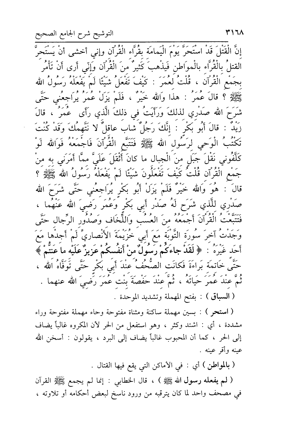 إِنَّ القَتْلَ قَدْ اسْتَحَرَّ يَوْمَ اليَمَامَةِ بِقُرَّاءِ القُرْآنِ، وَإِنِّي أَخْشَى أَنْ يَسْتَحِرَّ القَتْلُ بِالقُرَّاءِ بِالْمَوَاطِنِ، فَيَذْهَبَ كَثِيرٌ مِنَ القُرْآنِ، وَإِنِّي أَرَى أَنْ تَأْمُرَ بِجَمْعِ القُرْآنِ، قُلْتُ لِعُمَرَ: «كَيْفَ تَفْعَلُ شَيْئًا لَمْ يَفْعَلْهُ رَسُولُ اللَّهِ صَلَّى اللهُ عَلَيْهِ وَسَلَّمَ؟» قَالَ عُمَرُ: هَذَا وَاللَّهِ خَيْرٌ، «فَلَمْ يَزَلْ عُمَرُ يُرَاجِعُنِي حَتَّى شَرَحَ اللَّهُ صَدْرِي لِذَلِكَ، وَرَأَيْتُ فِي ذَلِكَ الَّذِي رَأَى عُمَرُ»، قَالَ زَيْدٌ: قَالَ أَبُو بَكْرٍ: إِنَّكَ رَجُلٌ شَابٌّ عَاقِلٌ لاَ نَتَّهِمُكَ، وَقَدْ كُنْتَ تَكْتُبُ الوَحْيَ لِرَسُولِ اللَّهِ صَلَّى اللهُ عَلَيْهِ وَسَلَّمَ، فَتَتَبَّعِ القُرْآنَ فَاجْمَعْهُ، «فَوَاللَّهِ لَوْ كَلَّفُونِي نَقْلَ جَبَلٍ مِنَ الجِبَالِ مَا كَانَ أَثْقَلَ عَلَيَّ مِمَّا أَمَرَنِي بِهِ مِنْ جَمْعِ القُرْآنِ»، قُلْتُ: «كَيْفَ تَفْعَلُونَ شَيْئًا لَمْ يَفْعَلْهُ رَسُولُ اللَّهِ صَلَّى اللهُ عَلَيْهِ وَسَلَّمَ؟»، قَالَ: هُوَ وَاللَّهِ خَيْرٌ، " فَلَمْ يَزَلْ أَبُو بَكْرٍ يُرَاجِعُنِي حَتَّى شَرَحَ اللَّهُ صَدْرِي لِلَّذِي شَرَحَ لَهُ صَدْرَ أَبِي بَكْرٍ وَعُمَرَ رَضِيَ اللَّهُ عَنْهُمَا، فَتَتَبَّعْتُ القُرْآنَ أَجْمَعُهُ مِنَ العُسُبِ وَاللِّخَافِ، وَصُدُورِ الرِّجَالِ، حَتَّى وَجَدْتُ آخِرَ سُورَةِ التَّوْبَةِ مَعَ أَبِي خُزَيْمَةَ الأَنْصَارِيِّ لَمْ أَجِدْهَا مَعَ أَحَدٍ غَيْرِهِ، {لَقَدْ جَاءَكُمْ رَسُولٌ مِنْ أَنْفُسِكُمْ عَزِيزٌ عَلَيْهِ مَا عَنِتُّمْ} [التوبة: 128] حَتَّى خَاتِمَةِ بَرَاءَةَ، فَكَانَتِ الصُّحُفُ عِنْدَ أَبِي بَكْرٍ حَتَّى تَوَفَّاهُ اللَّهُ، ثُمَّ عِنْدَ عُمَرَ حَيَاتَهُ، ثُمَّ عِنْدَ حَفْصَةَ بِنْتِ عُمَرَ رَضِيَ اللَّهُ عَنْهُ.