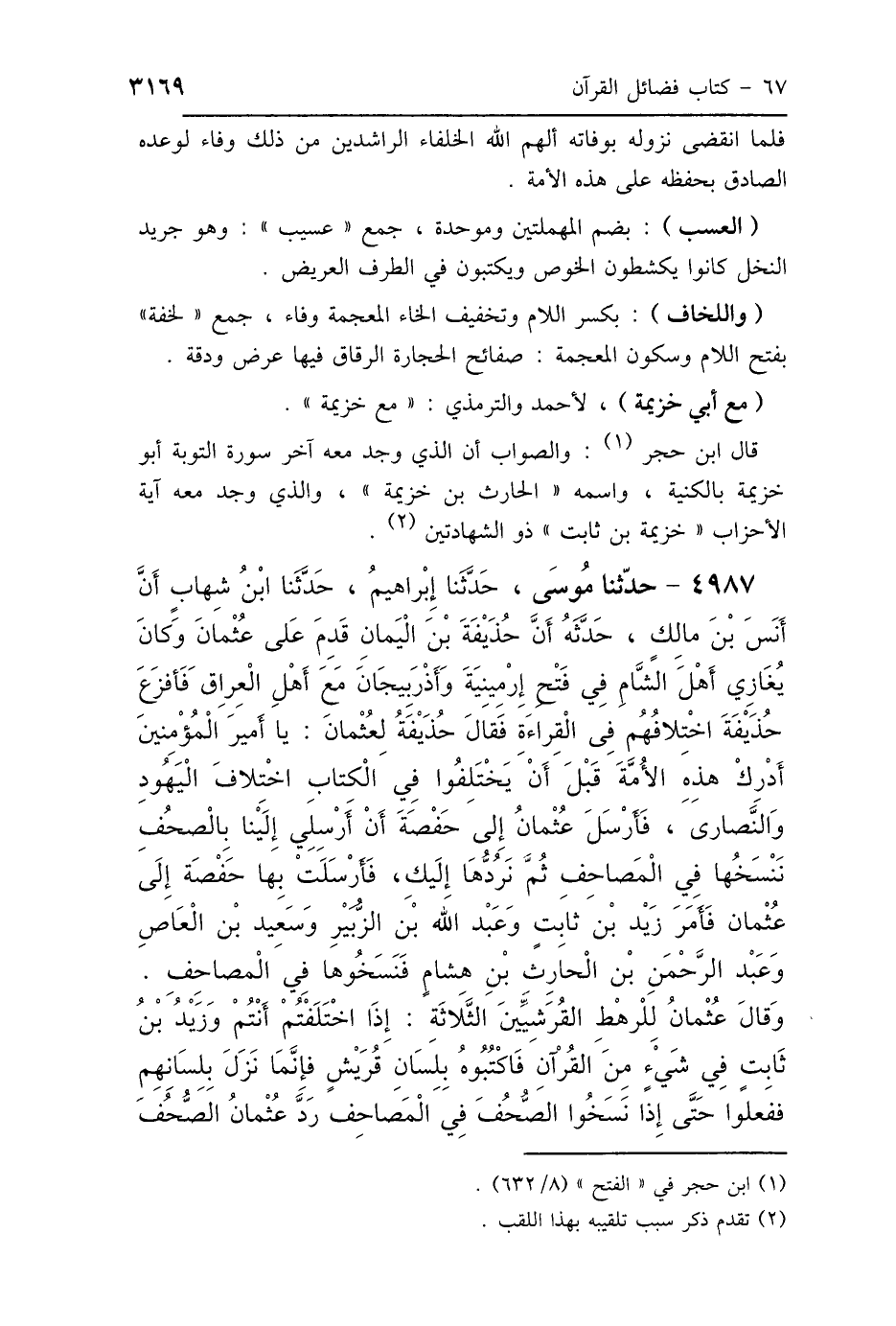 قال ابن حجر: والصواب أن الذي وجد معه آخر سورة التوبة أبو خزيمة بالكنية، واسمه "الحارث بن خزيمة"، والذي وجد معه آية الأحزاب "خزيمة بن ثابت" ذو الشهادتين.