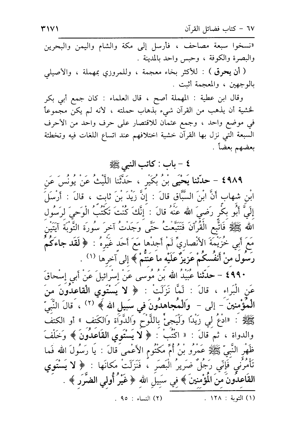 4990 - حَدَّثَنَا عُبَيْدُ اللَّهِ بْنُ مُوسَى، عَنْ إِسْرَائِيلَ، عَنْ أَبِي إِسْحَاقَ، عَنِ البَرَاءِ، قَالَ: لَمَّا نَزَلَتْ: {لاَ يَسْتَوِي} [النساء: 95] القَاعِدُونَ مِنَ المُؤْمِنِينَ {وَالمُجَاهِدُونَ فِي سَبِيلِ اللَّهِ} [النساء: 95]، قَالَ النَّبِيُّ صَلَّى اللهُ عَلَيْهِ وَسَلَّمَ: «ادْعُ لِي زَيْدًا وَلْيَجِئْ بِاللَّوْحِ وَالدَّوَاةِ وَالكَتِفِ - أَوِ الكَتِفِ وَالدَّوَاةِ -» ثُمَّ قَالَ: " اكْتُبْ {لاَ يَسْتَوِي القَاعِدُونَ} [النساء: 95] " وَخَلْفَ ظَهْرِ النَّبِيِّ صَلَّى اللهُ عَلَيْهِ وَسَلَّمَ عَمْرُو بْنُ أُمِّ مَكْتُومٍ الأَعْمَى، قَالَ: يَا رَسُولَ اللَّهِ فَمَا تَأْمُرُنِي، فَإِنِّي رَجُلٌ ضَرِيرُ البَصَرِ؟ فَنَزَلَتْ مَكَانَهَا: {لاَ يَسْتَوِي القَاعِدُونَ مِنَ المُؤْمِنِينَ} [النساء: 95] {وَالمُجَاهِدُونَ فِي سَبِيلِ اللَّهِ} [النساء: 95] {غَيْرُ أُولِي الضَّرَرِ} [النساء: 95].