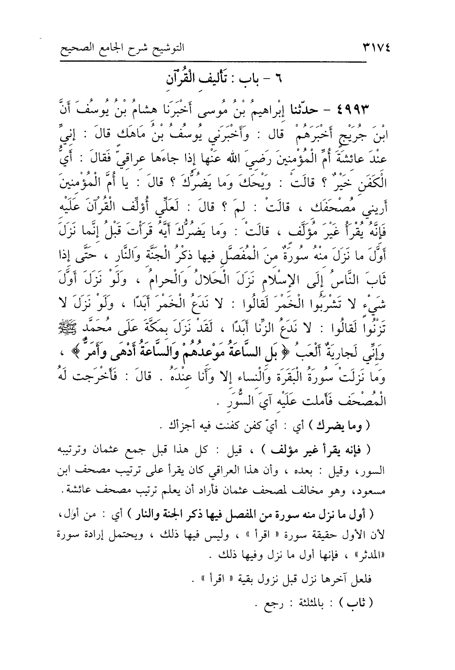 4993 - حَدَّثَنَا إِبْرَاهِيمُ بْنُ مُوسَى، أَخْبَرَنَا هِشَامُ بْنُ يُوسُفَ، أَنَّ ابْنَ جُرَيْجٍ أَخْبَرَهُمْ، قَالَ: وَأَخْبَرَنِي يُوسُفُ بْنُ مَاهَكٍ، قَالَ: إِنِّي عِنْدَ عَائِشَةَ أُمِّ المُؤْمِنِينَ رَضِيَ اللَّهُ عَنْهَا، إِذْ جَاءَهَا عِرَاقِيٌّ، فَقَالَ: أَيُّ الكَفَنِ خَيْرٌ؟ قَالَتْ: وَيْحَكَ، وَمَا يَضُرُّكَ؟ " قَالَ: يَا أُمَّ المُؤْمِنِينَ، أَرِينِي مُصْحَفَكِ؟ قَالَتْ: لِمَ؟ قَالَ: لَعَلِّي أُوَلِّفُ القُرْآنَ عَلَيْهِ، فَإِنَّهُ يُقْرَأُ غَيْرَ مُؤَلَّفٍ، قَالَتْ: وَمَا يَضُرُّكَ أَيَّهُ قَرَأْتَ قَبْلُ؟ " إِنَّمَا نَزَلَ أَوَّلَ مَا نَزَلَ مِنْهُ سُورَةٌ مِنَ المُفَصَّلِ، فِيهَا ذِكْرُ الجَنَّةِ وَالنَّارِ، حَتَّى إِذَا ثَابَ النَّاسُ إِلَى الإِسْلاَمِ نَزَلَ الحَلاَلُ وَالحَرَامُ، وَلَوْ نَزَلَ أَوَّلَ شَيْءٍ: لاَ تَشْرَبُوا الخَمْرَ، لَقَالُوا: لاَ نَدَعُ الخَمْرَ أَبَدًا، وَلَوْ نَزَلَ: لاَ تَزْنُوا، لَقَالُوا: لاَ نَدَعُ الزِّنَا أَبَدًا، لَقَدْ نَزَلَ بِمَكَّةَ عَلَى مُحَمَّدٍ صَلَّى اللهُ عَلَيْهِ وَسَلَّمَ وَإِنِّي لَجَارِيَةٌ أَلْعَبُ: {بَلِ السَّاعَةُ مَوْعِدُهُمْ وَالسَّاعَةُ أَدْهَى وَأَمَرُّ} [القمر: 46] وَمَا نَزَلَتْ سُورَةُ البَقَرَةِ وَالنِّسَاءِ إِلَّا وَأَنَا عِنْدَهُ "، قَالَ: فَأَخْرَجَتْ لَهُ المُصْحَفَ، فَأَمْلَتْ عَلَيْهِ آيَ السُّوَرِ.