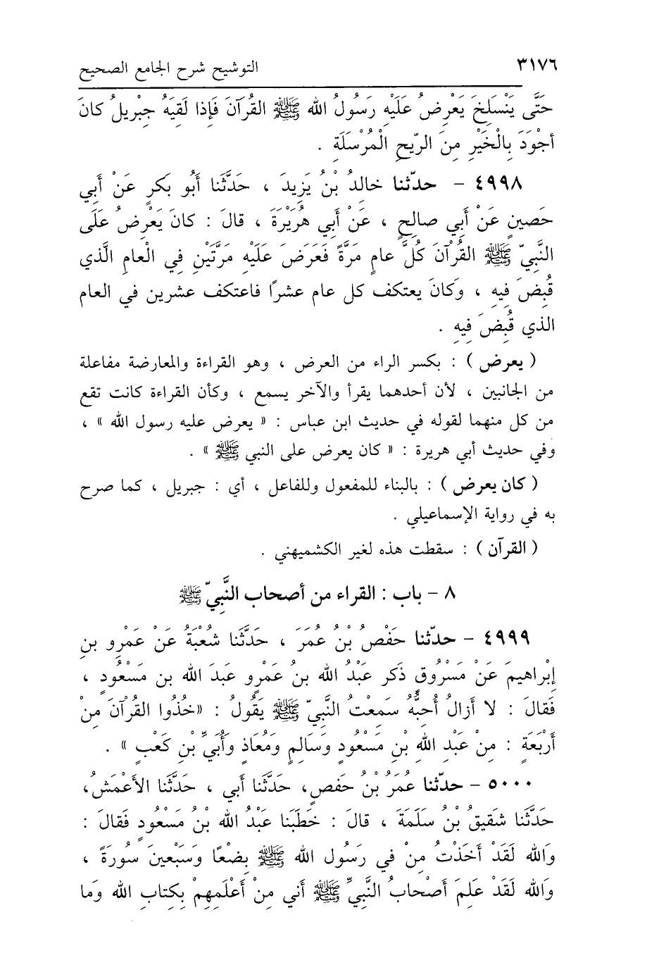 4998 - حَدَّثَنَا خَالِدُ بْنُ يَزِيدَ، حَدَّثَنَا أَبُو بَكْرٍ، عَنْ أَبِي حَصِينٍ، عَنْ أَبِي صَالِحٍ، عَنْ أَبِي هُرَيْرَةَ، قَالَ: «كَانَ يَعْرِضُ عَلَى النَّبِيِّ صَلَّى اللهُ عَلَيْهِ وَسَلَّمَ القُرْآنَ كُلَّ عَامٍ مَرَّةً، فَعَرَضَ عَلَيْهِ مَرَّتَيْنِ فِي العَامِ الَّذِي قُبِضَ فِيهِ، وَكَانَ يَعْتَكِفُ كُلَّ عَامٍ عَشْرًا، فَاعْتَكَفَ عِشْرِينَ فِي العَامِ الَّذِي قُبِضَ فِيهِ».